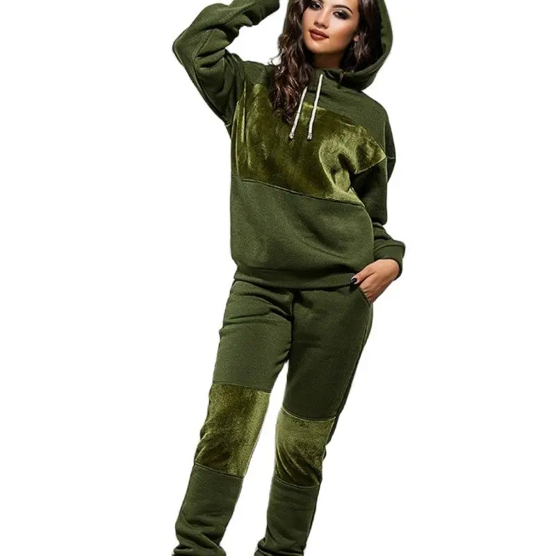 Модный Бархатный спортивный костюм в стиле пэчворк с длинным рукавом, утепленные толстовки с капюшоном, комплект из 2 предметов, повседневный спортивный костюм, женский комплект из двух предметов