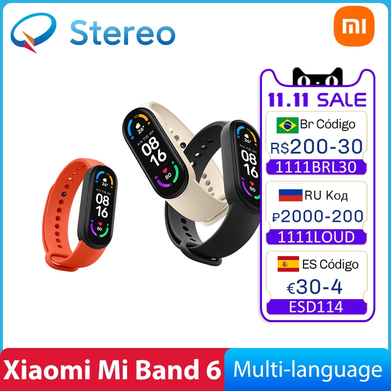 Смарт-браслет Xiaomi Mi Band 6, водонепроницаемый фитнес-трекер с AMOLED экраном, с функцией измерения пульса и уровня кислорода в крови, Bluetooth, 6 цветов