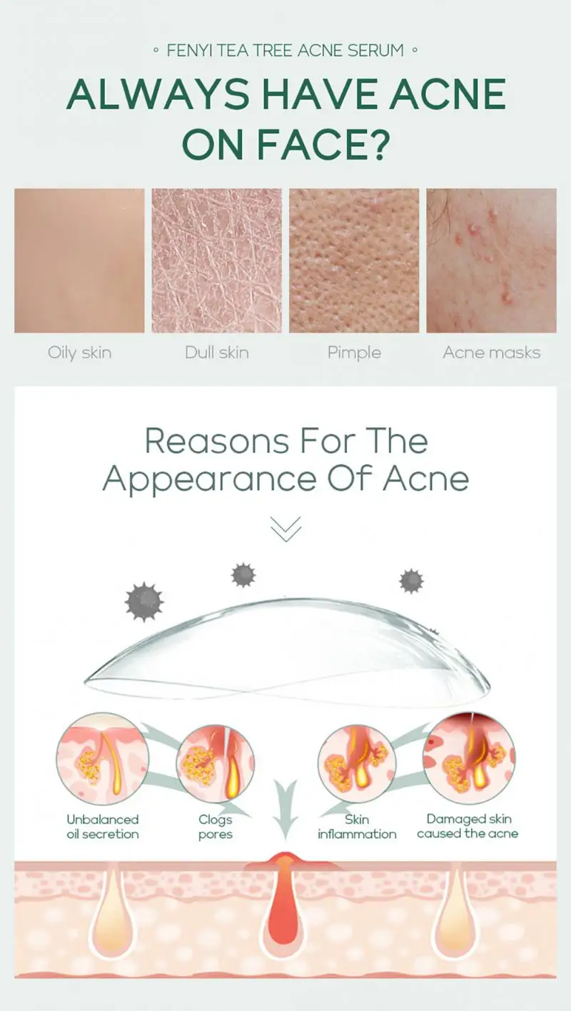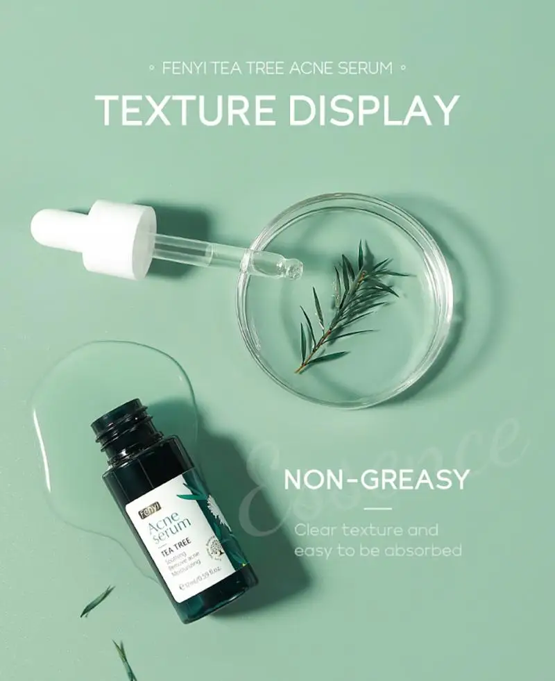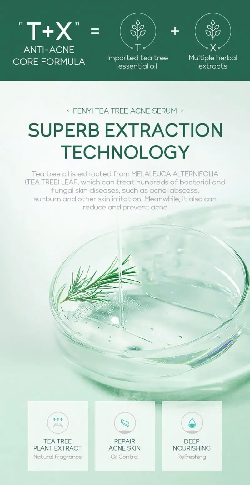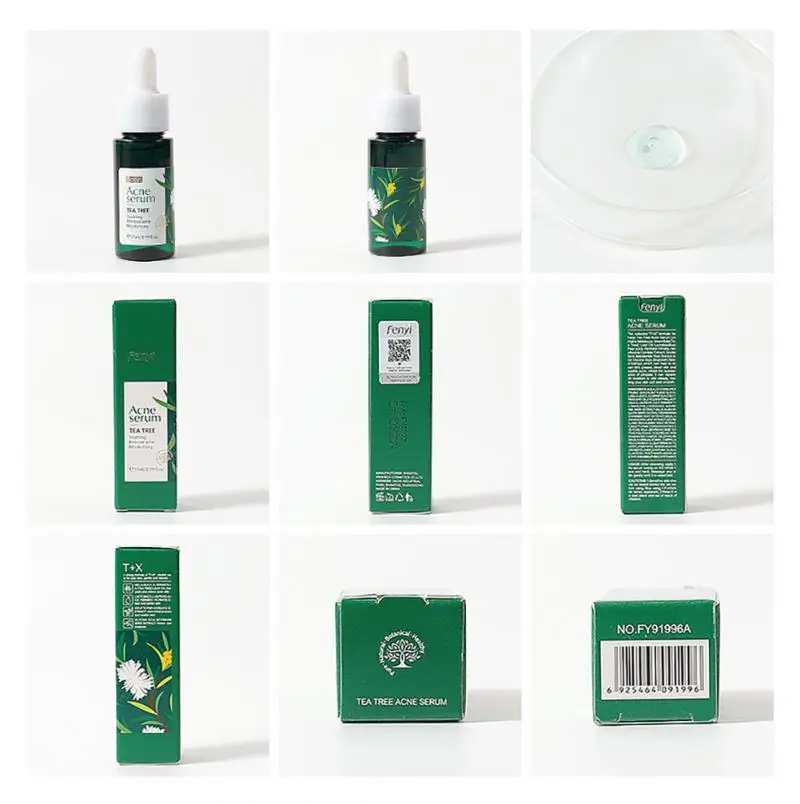 Выбранная формула «T + X» для сыворотки угрей чайного дерева Fenyi содержит масло листьев мелалеуки альтернифолии (чайное дерево), лактобактерию/фермент грушевого сока, экстракт корданных Houttuynia, экстракт корня Baicalensis Scutellaria и экстракт семян глицина сои (СОИ), который может помочь очистить грязь, жир, омертвевшую кожу и успокоить акне, Препятствует появлению прыщей. Он может глубоко впитывать влагу, делая вашу кожу мягкой и гладкой.