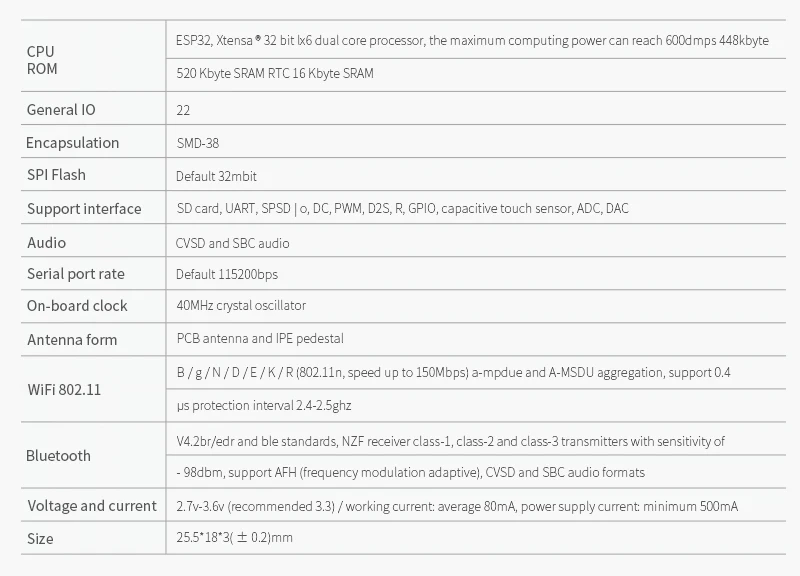 Esp32 используется для интеграции WIFL, традиционные Bluetooth и ble beacon, с два Не доверяй своим глазам производительность 32-blt lx6cpu, 7-ступенчатая plpeline archltecture, основная частота диапазон регулировки от 80 МГц до 240 МГц датчик на чип: JAL датчик, датчик температуры и т. Д.