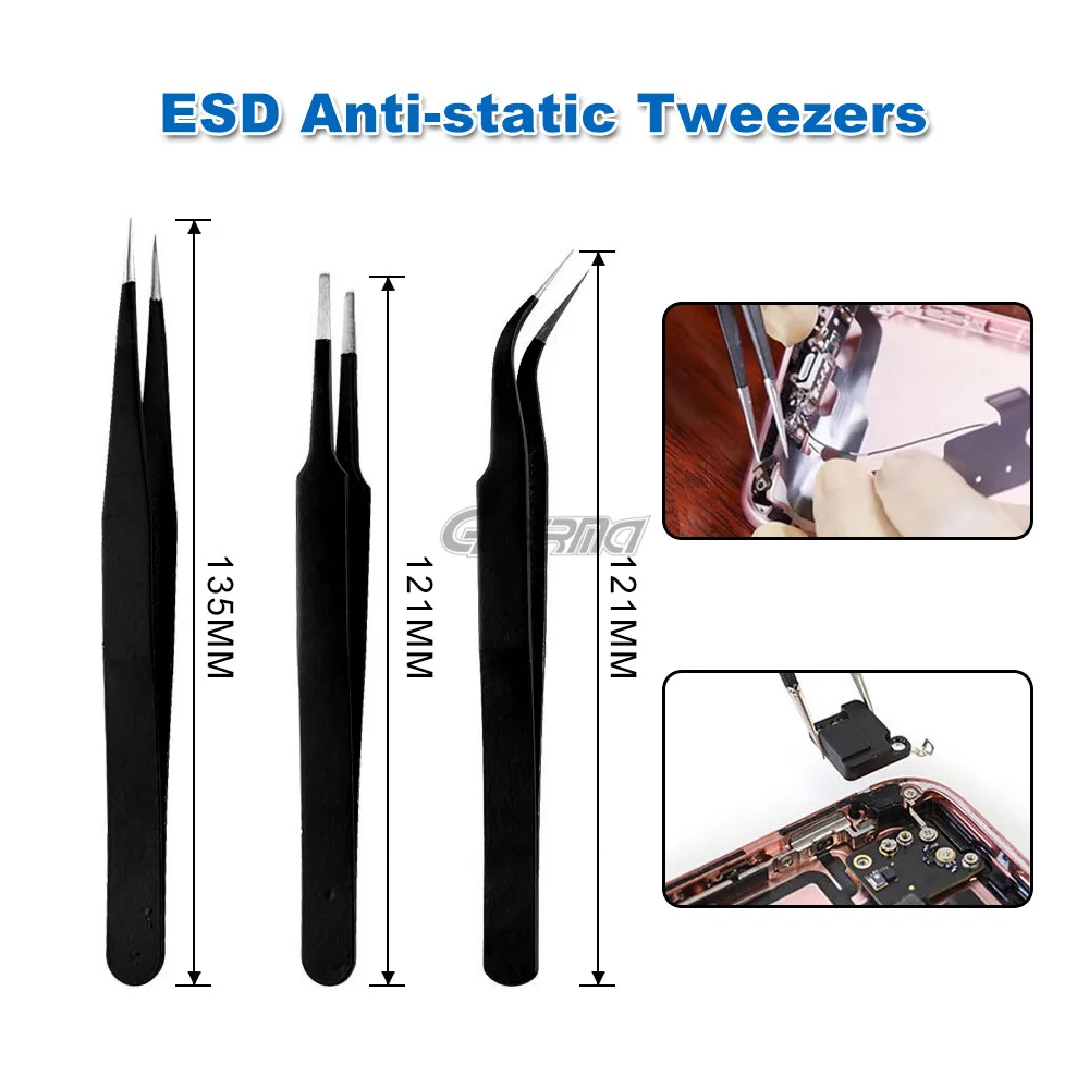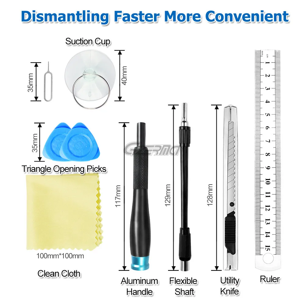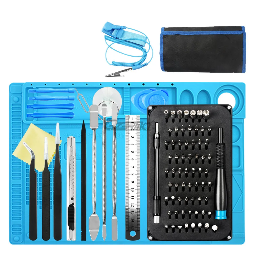 Инструментарий-ваш высокопроизводительный инструментарий для всех вещей85 в 1 комплект отверток:● 1х нож-Оснастка лезвия дизайн обеспечивает острый край каждый раз. Блокировка лезвия регулировка означает, что лезвие остается там, где вы имеете в виду.● 1x антистатический ремешок для запястья-Защита цепей от статического электричества.● 3x ESD пинцет-Точный Пинцет для обработки небольших проводов, винтов и достижения там, где пальцы не могут.● 4x Пластиковые инструменты для вскрытия-мягкие пластиковые инструменты для уборки.● 3х металлический двусторонний шпулер-для более мощного подавления, соскабливания, зондирования и подтягивания● 2x пластиковый треугольный открывающийся инструмент-тонкий инструмент для вскрытия электронных устройств.● 1 металлическая линейка-облегчает измерение деталей!● 1 нейлоновая кромка● 1 салфетка для очистки экрана, очков, линз.● 1 присоска-для удаления экрана.● 1x эжектор sim-карты-легко открывать/удалять/извлекать sim-карту.● 1 водонепроницаемая сумка Oxford-удобное хранение.• 1x64 бита набор отвертокГайка драйвера-2,5, 3, 3,5, 4,0, 4, 5, 5,0, 5,5 мм√ Tri-point-0,6, 2,0, 2,5, 3,0 мм√Hex-0,7, 0,9, 1,3, 1,5, 2, 2,5, 3, 3,5, 4, 4,5, 5,0, 5,5 мм√JIS - J000, J00, J0, J1 Pentalobe-0,8, 1,2, 1,5 мм√Torx Security- TR6, TR7, TR8, TR9, TR10, TR15, TR20, TR25√Torx - T1,T2, T3, T4, T5√Flathead - 1, 1,5, 2, 3, 4 мм√Phillips - 000, 00, 0, 1, 2√Square -0, 1, 2√Гаечный ключ-1,7, 2,0, 8√Triangle - 2, 2,3 мм√SIM съемных бит√Oval езды на автомобиле√Magnetic пикап√IPhone противостояние√ Адаптер драйвера от 1/4 до 4 мм【 Высококачественная теплоизоляционная подкладка 】Высокая термостойкость 500 ° C.Расположение севарального отверстия для крепежных винтов, микросхем и небольших деталей.Сделайте ремонт легким.Хороший партнер для пистолета горячего воздуха.3 размера можно выбрать:SP1239:336*226 ммSP1240:413*282 ммSP1241:400*290 мм
