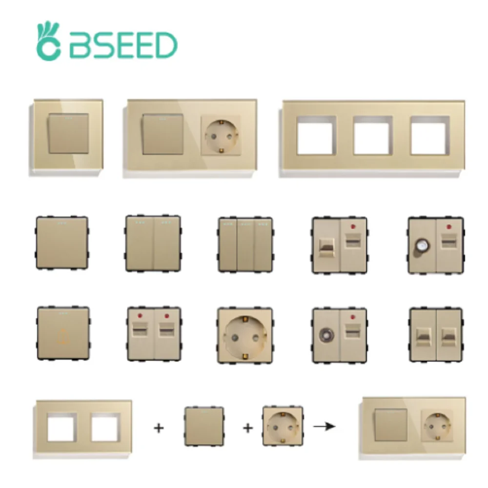 Настенные выключатели BSEED, золотистые стеклянные рамки, USB-розет...
