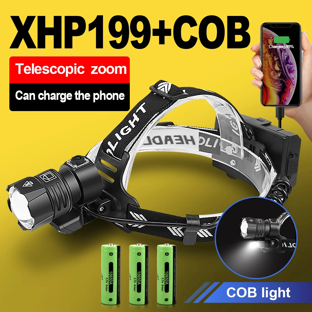 Новый XHP199 высокомощный светодиодный налобный фонарь USB 18650 перезаряжаемый налобный фонарь тактический охотничий зум-налобный фонарь COB рабочий рыболовный налобный фонарь