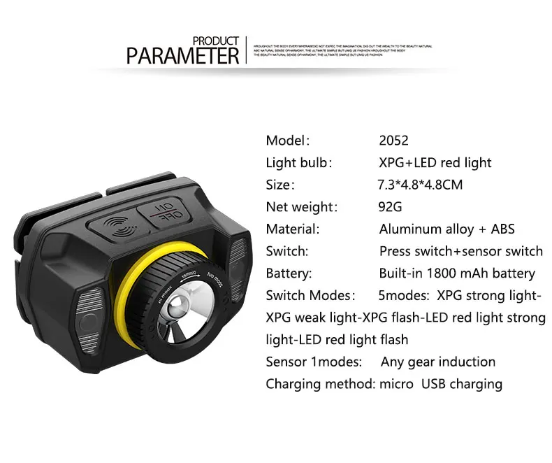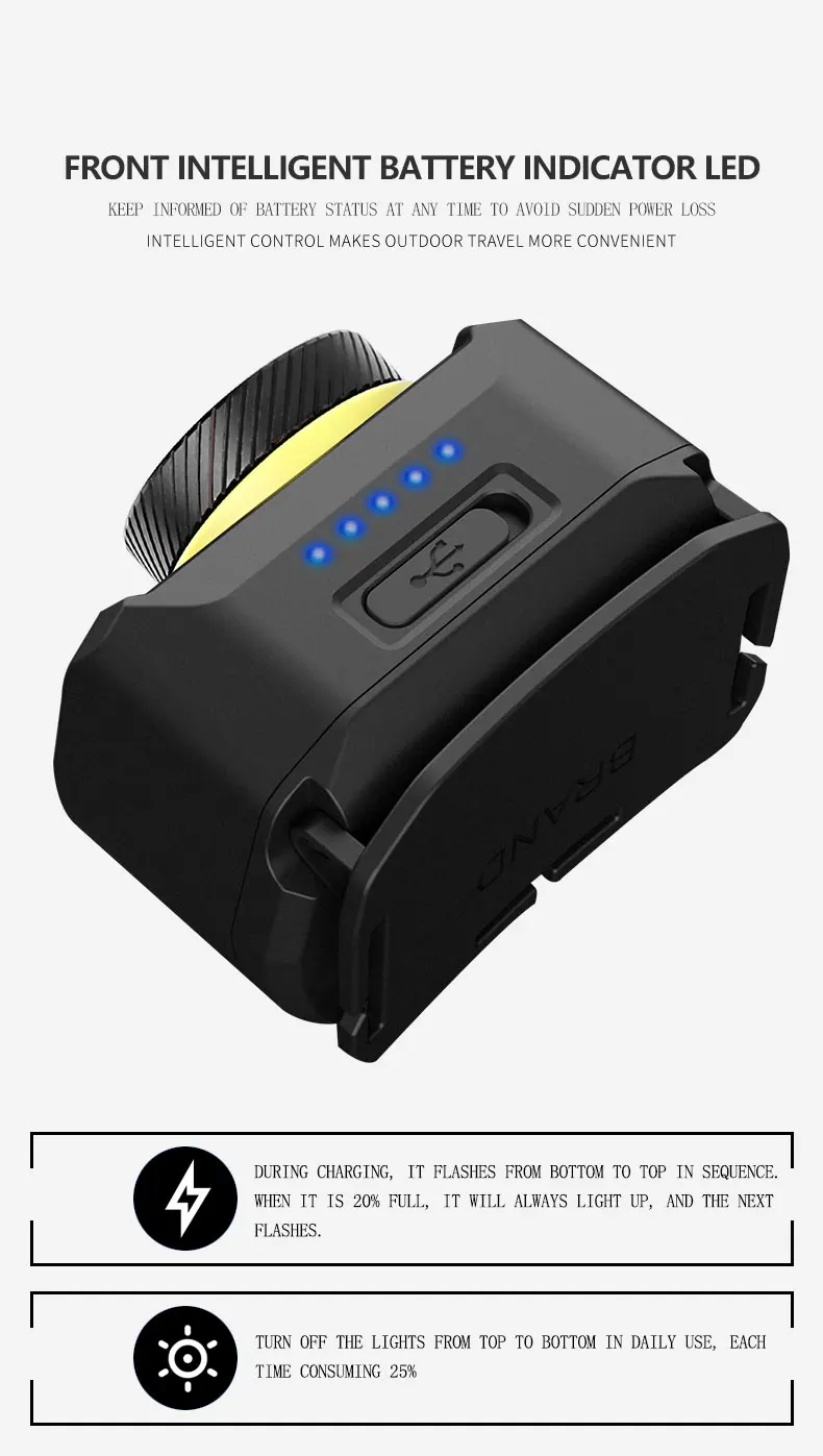 The portable outdoor indnctive light is all-perspectively designed, the USB port charging adds a stronger power on it. The main light is LED. Special double-switch design to ensure you a convert modes convert. Hight-capacity rechargeable battery offers a long lasting powering for safer outdoor sports. The headlamp is mainly used for fishing, hunting, night running, hiking and camping.