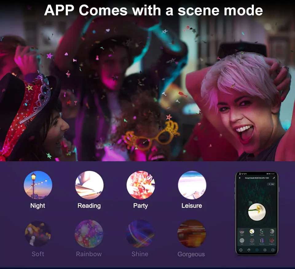 5.Жизнь красочная жизнь--- Разработан с более чем 16 миллионов цветов на выбор, сцен DIY, расписание функции и 1500lm(2700k-6500k) теплый белый. Просто Переключитесь на желаемый светильник, чтобы соответствовать вашему настроению и настроить яркость для удовлетворения ваших потребностей.