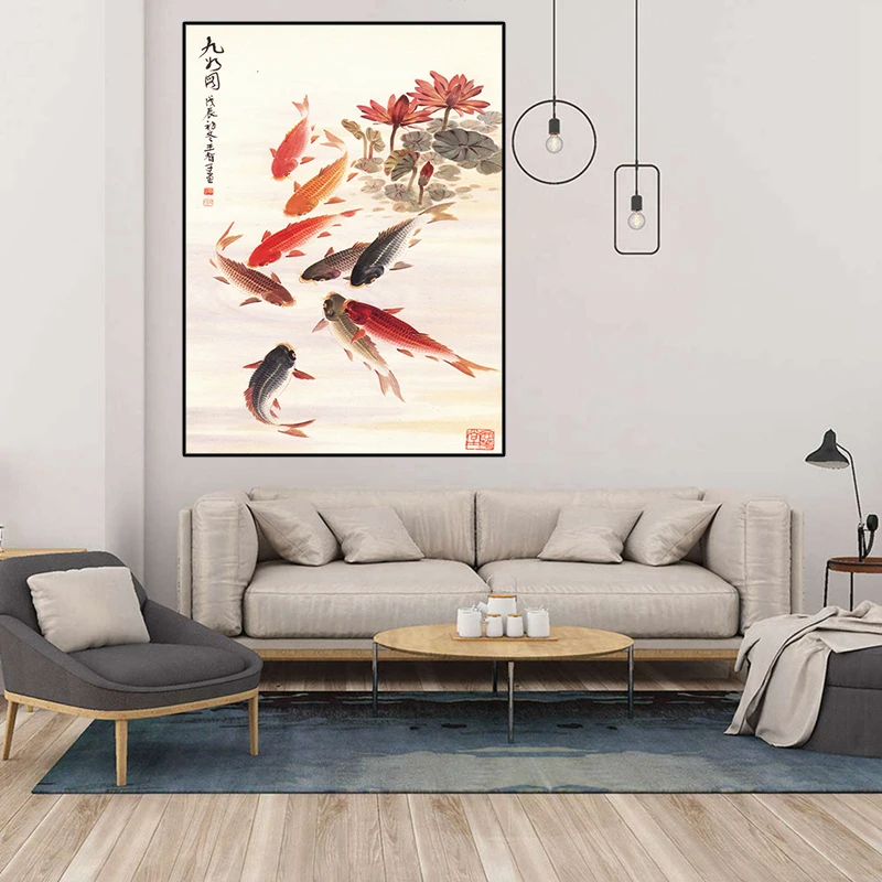 Китайская традиционная каллиграфия, картина, кои рыбы, лотос, холст, плакат, печать, Настенная картина для гостиной, украшение для дома