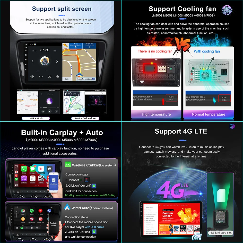 > Android 11 + API 29 + IPS экран + разрешение 1280*720 + Восьмиядерный + 8 Гб ОЗУ + 128 Гб ПЗУ + беспроводной Carplay + проводной Android Auto + DSP + оптический выход + коаксиальный выход + алюминиевый радиатор + Встроенный вентилятор + Встроенный Wi-Fi + 4G LTE + gps-навигация + управление рулевым колесом + BT5.0 + Встроенный микрофон + Поддержка функции USB ADAS DVR + Функция Europe DAB + 1080P Vedio Play + поддержка AHD 1080P HD Камера