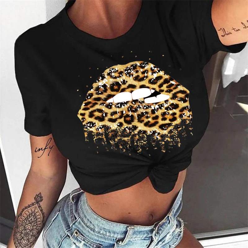 Модная летняя футболка с акварельным леопардовым принтом губ, женск...