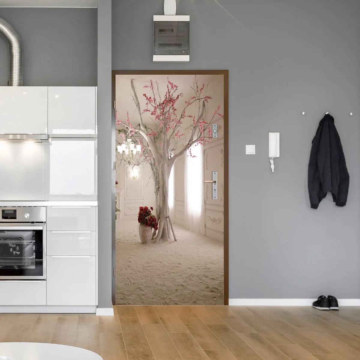 Обои для двери в помещении, вишневые цветы, кухонные, гостиная, ван...
