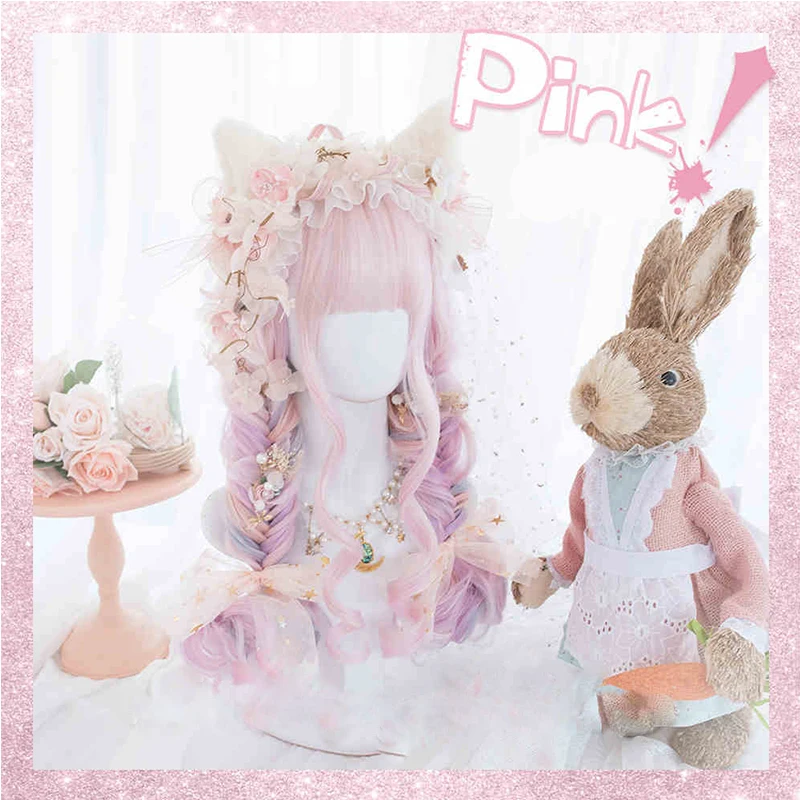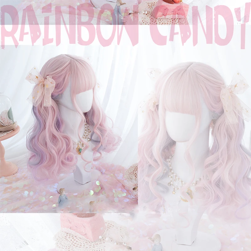 Синтетические радужные цветные фиолетовые розовые парики в стиле "Лолита" для женщин, искусственные натуральные вьющиеся волосы, машинное изготовление, высокая температура