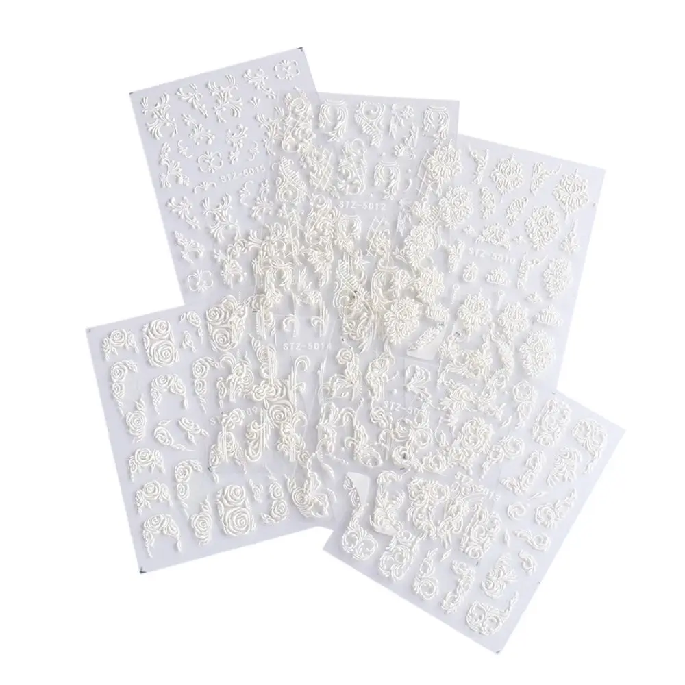 5D акриловые белые свадебные дизайнерские наклейки для ногтей тисненые Цветочные кружевные клейкие наклейки французские зимние слайдеры DIY Маникюрный Декор