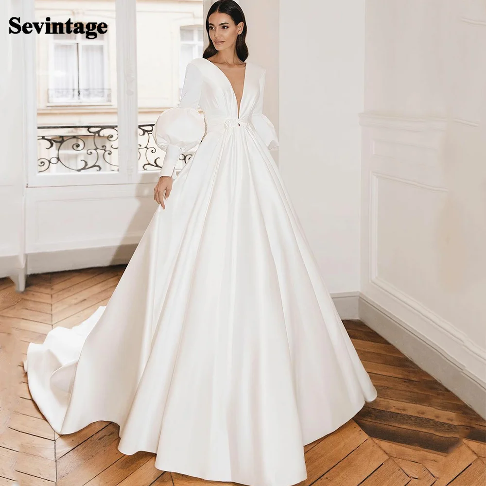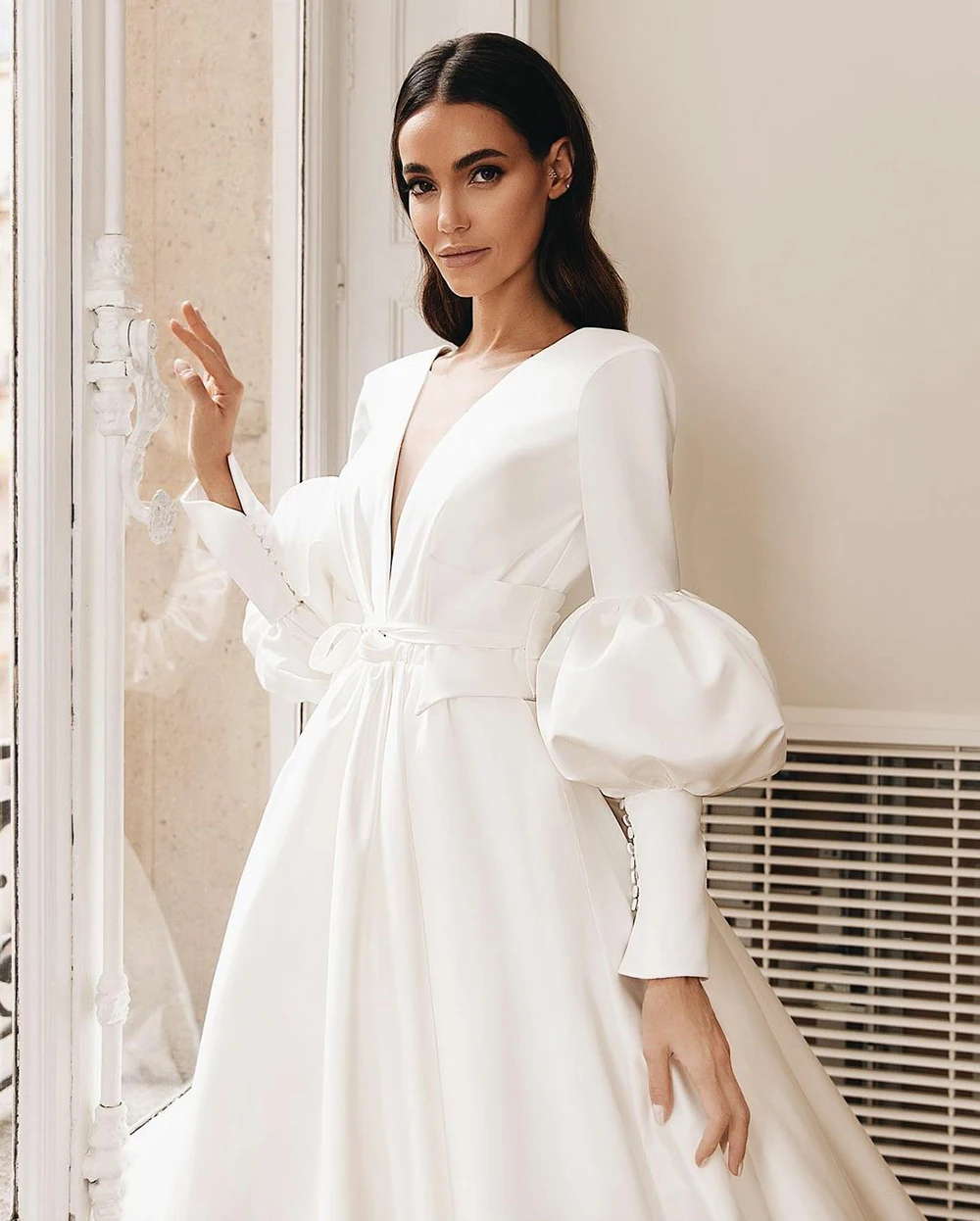 Белое свадебное платье с V-образным вырезом и пышными рукавами