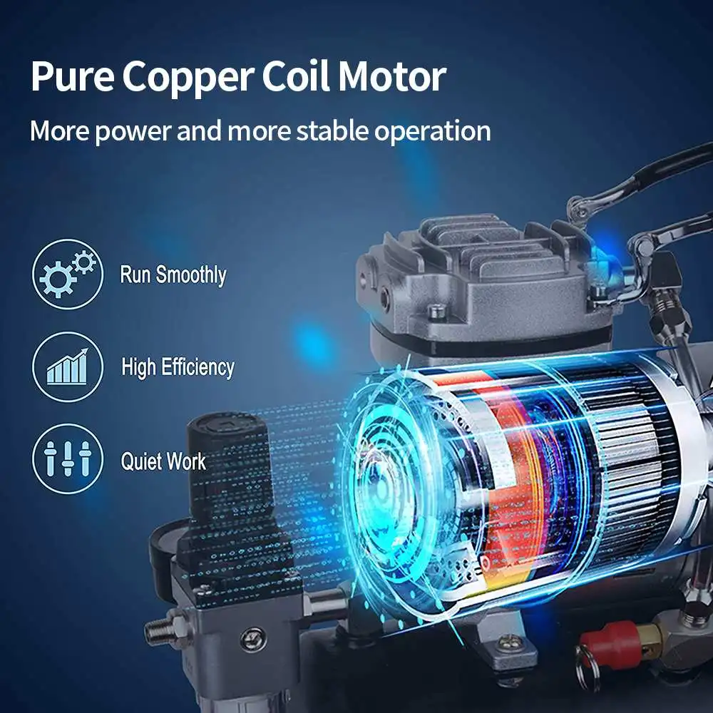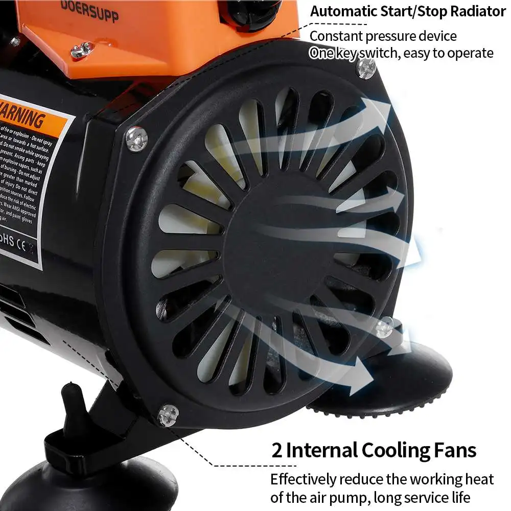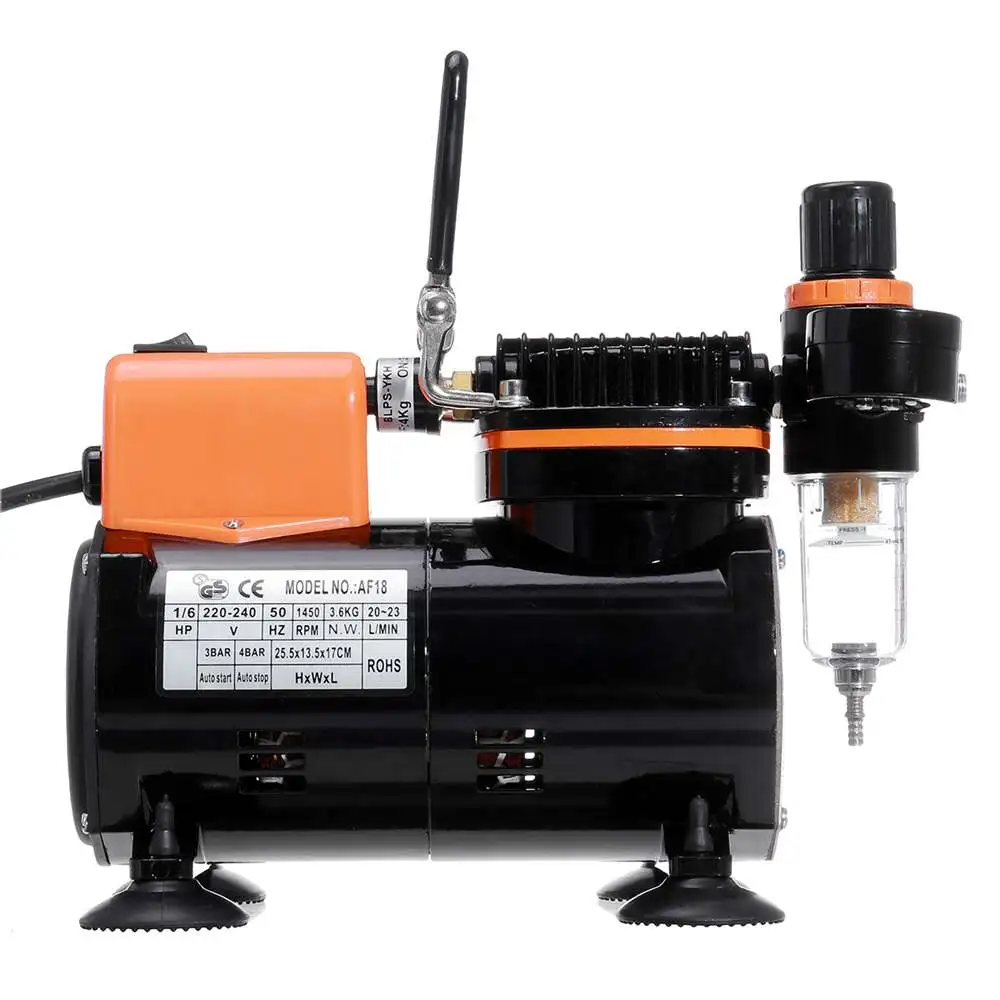 Особенности:-Поршневой компрессор без масла с манометром, регулятором давления воздуха и воздушным фильтром.Автозапуск (3Bar)-Autostop(4Bar), поток воздуха, 20-23L/мин, б/у с любым Аэрограф пистолеты с насадками из 0,2 до 1,0 мм.-Профессиональный Аэрограф Комплект включает в себя новый модернизированный безмасляный поршневой воздушный компрессор системы. Оснащен 0,3 мм одинарного действия пистолет. Отвечает всем вашим домашним потребностям.-Высокопроизводительный Мощный однопоршневой компрессор 1/6 л.с. с двумя охлаждающими вентиляторами, которые позволяют ему работать намного прохладнее в течение более длительного времени непрерывной работы без перегрева. Включает держатель Аэрограф Для 1 airbrushe.-Мощный. Продолжать работать, мощное давление и автоматический старт-стоп, обеспечивая первоклассную производительность покрытия.-Встроенное устройство рассеивания тепла, устройство защиты от перегрева, двигатель перегревается случайно, он автоматически перезагружается после охлаждения.-Удобный. Легкий, 180 ° портативная ручка и держатель Аэрограф, делает его удобным для переноски или транспортировки.-Многофункциональный. Идеально подходит для искусства, украшения тортов, косметики и любых других видов деятельности по очистке воздуха.-Исполнительные Стандарты: CE, GS, ROHS, ETL.