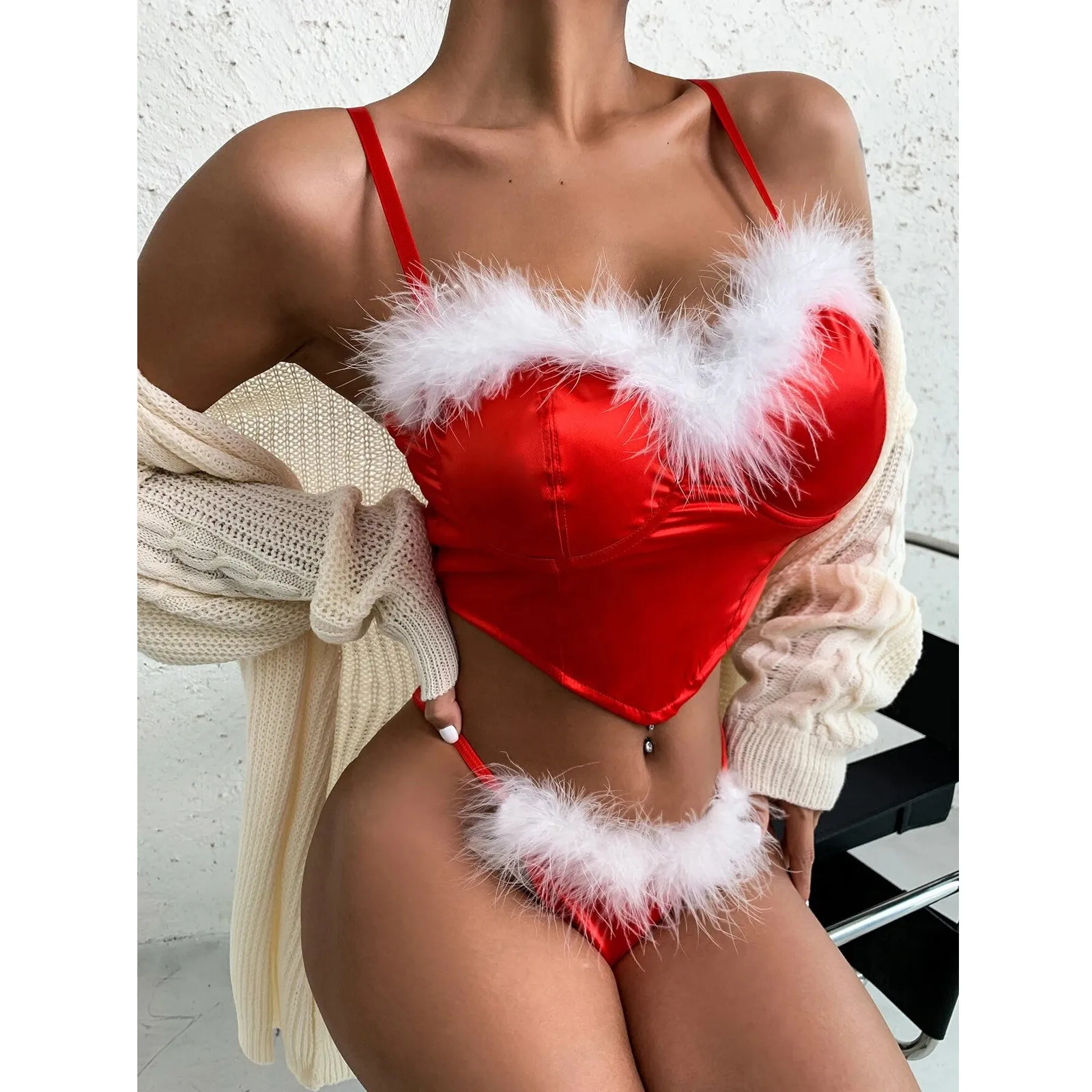 Рождественский сексуальный комплект нижнего белья, форма, соблазнительное Новогоднее праздничное Эротическое белье с перьями, красные Костюмы для ролевых игр, экзотические комплекты