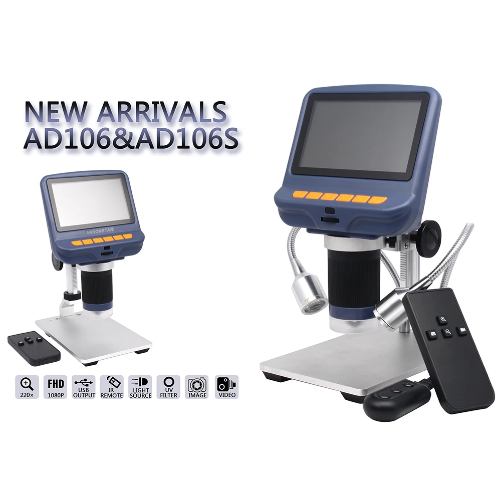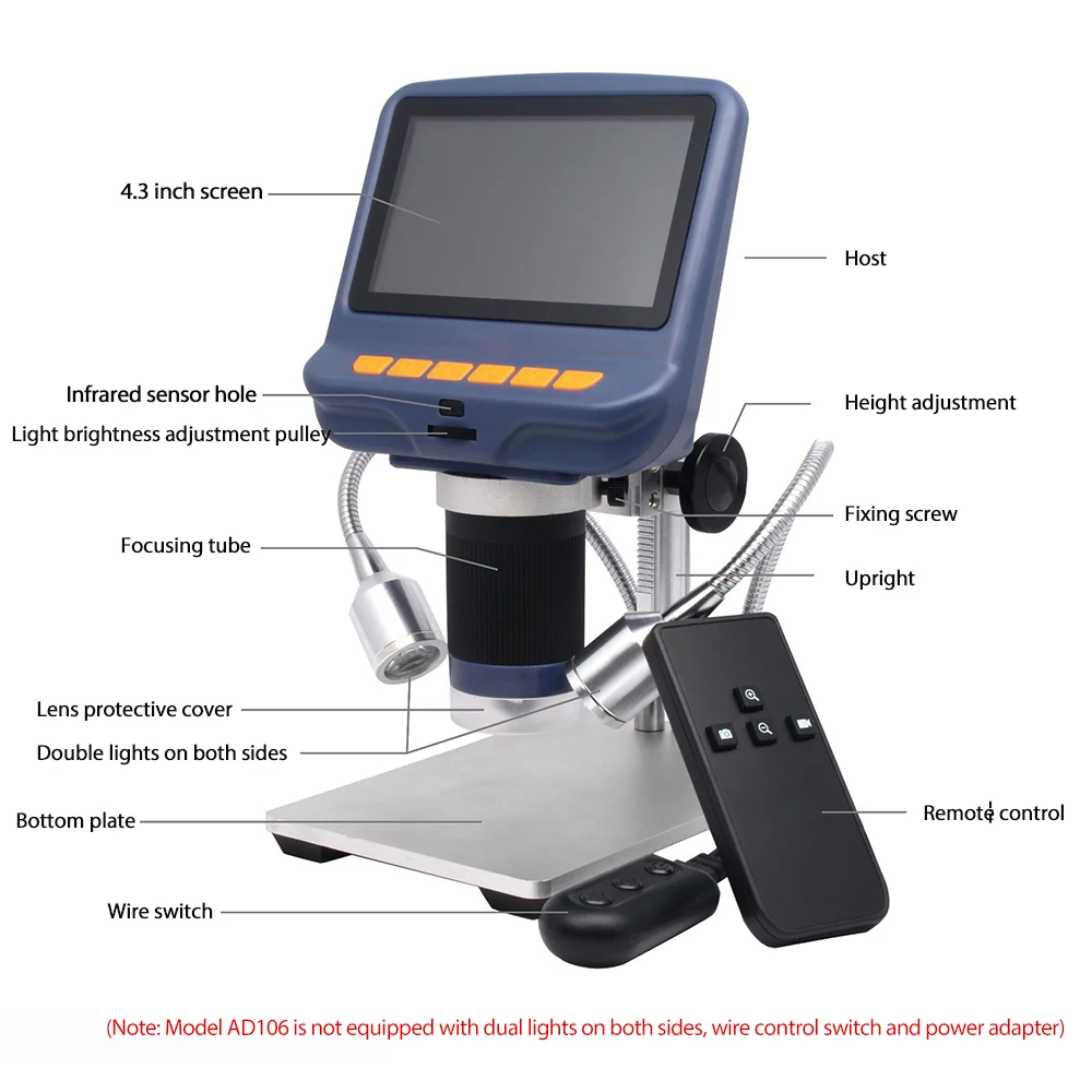 AD106S AD106 220X Цифровые микроскопы с 4,3 дюймов ЖК-дисплей Дисплей для электронных пайки телефон ремонт часовХарактеристика:Инфракрасный пульт дистанционного управления: он принимает инфракрасную индукционную конструкцию, которая очень удобна для вас, чтобы управлять с помощью пульта дистанционного управления.УФ-фильтр: стеклянный Ультрафиолетовый фильтр не только защищает объектив от высокой температуры и дыма, но и уменьшает отражение.Регулируемый фокус и светодиодный светильник: Фокусировка и яркость 8 светодиодный ных ламп могут регулироваться ручкой по мере необходимости.Широкий диапазон применения: увеличение до 220X, который используется для ремонта печатных плат, идентификации ювелирных изделий, наблюдения за насекомыми, обучения и исследований и т. д.Спецификация:Модель: AD106S (с 2 лампами на базе, с кабелем переключения), AD106 (опционально)Материал: ABS + SSДатчик изображения: высококачественный HD ДатчикВидеовыход: 1280P (full HD), 720P (HD)Увеличение: до 220x (непрерывный зум)Формат видео: AVIФормат изображения: JPEGРазрешение изображения: 1280*720P-4032*3024PДиапазон фокусировки: 2 ~ 10,5 смЧастота кадров: 30 кадров в секундуUsb-порт: USB 2,0Память: поддерживает карту памяти до 32 Гб (не входит в комплект)Источник питания: 5 В постоянного токаИсточник: светильник8 встроенных светодиодов и 2 светодиода на подставке (AD106S)8 встроенных светодиодов (AD106)Экран Размер: 4,3"Батарея дистанционного управления: батарейка CR2025 (не входит в комплект)Размер стенда: 19,5*16*10 смПримечание:Возможны незначительные отклонения в размере из-за ручного измерения, различных методов измерения и инструментов.Изображение может не отражать фактический цвет изделия из-за различного фотографирования светильник, угол и монитор.Посылка включает в себя:AD106S1 X микроскоп1 металлическая подставка (с 2 лампами)1 пульт дистанционного управления1 х Кабель питания1 х USB кабель1 х адаптер питания1 х УФ-фильтр1 X клейкая лента1 х РуководствоAD1061 X микроскоп1 X металлическая подставка (без подсветки)1 пульт дистанционного управления1 х USB кабель1 х УФ-фильтр1 X клейкая лента1 х Руководство