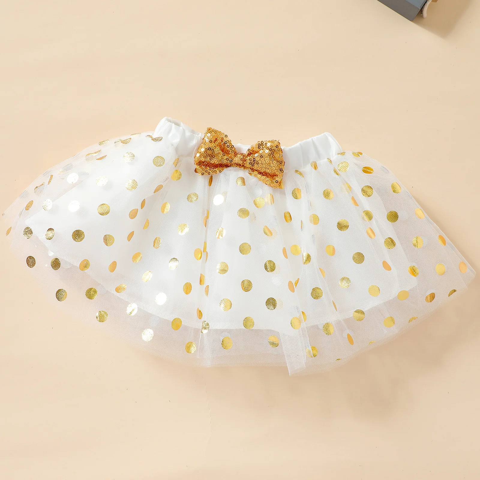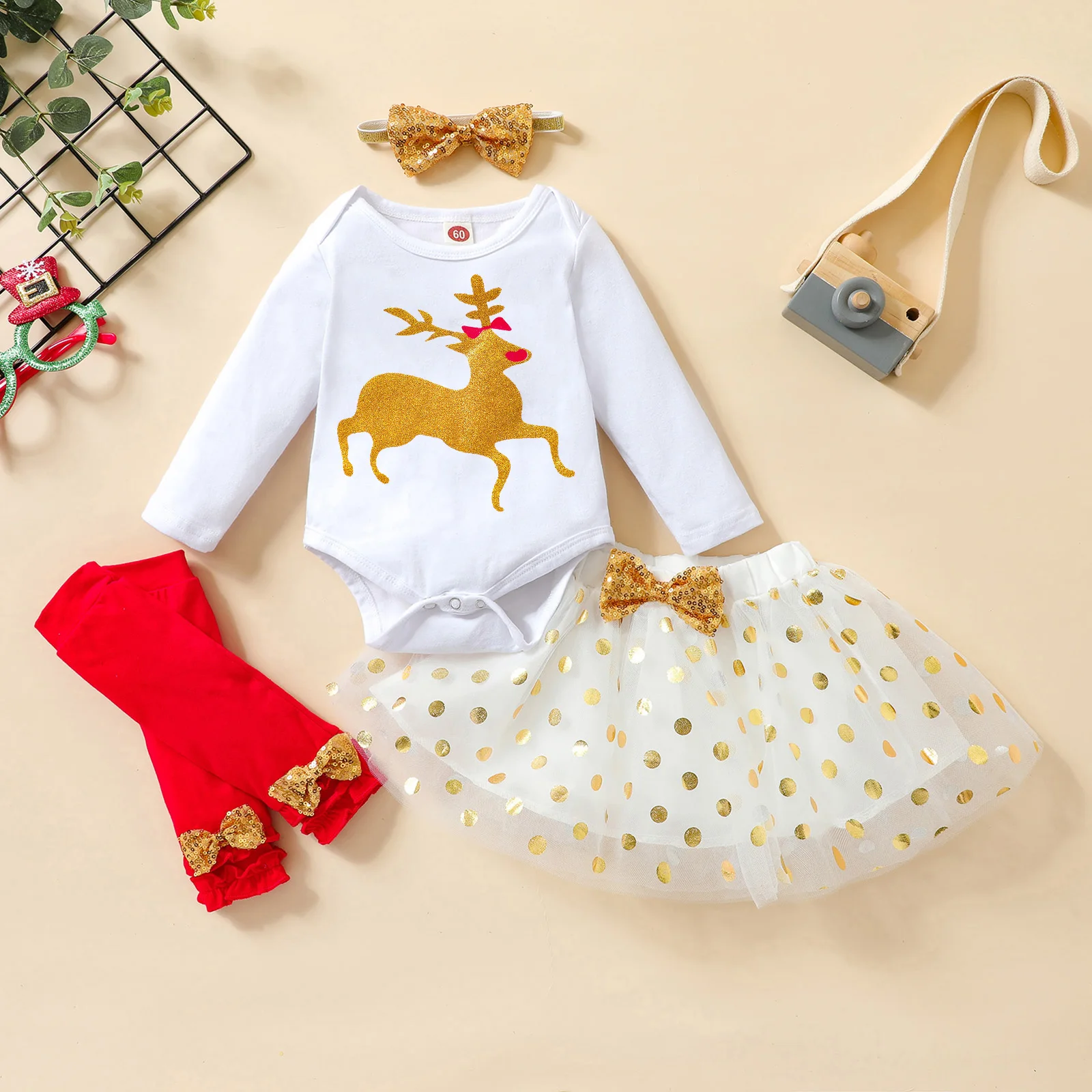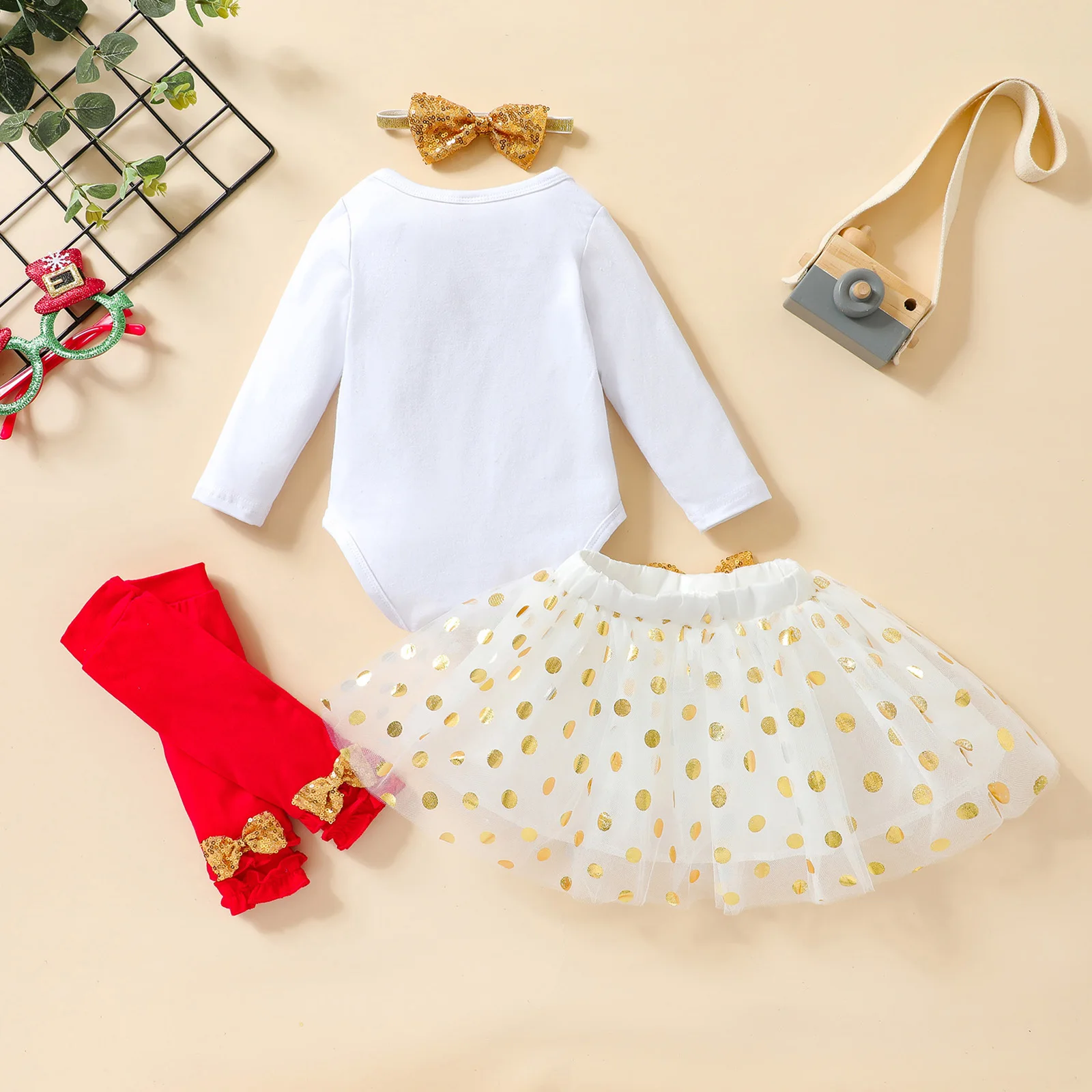 Emmababy Рождественская одежда из 4 предметов для маленьких девочек, Детский комбинезон с длинным рукавом и круглым вырезом, сетчатая юбка в горошек, леггинсы, головной убор