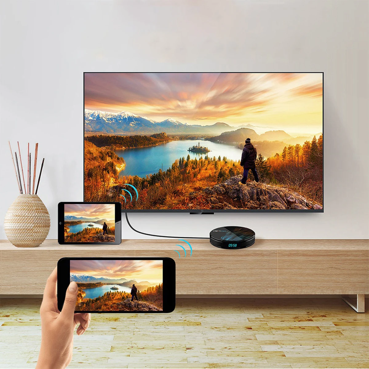 Наслаждайтесь высоким качеством видео всего за 3 шага: подключите к телевизору/проектору/монитору через hd-кабель-> Подключите к Интернету через встроенный Wi-Fi или Ethernet LAN -> выберите Видео вход по телевизору, теперь вы можете смотреть все, что вам нравится. Все настройки могут быть завершены в течение 5 минут.