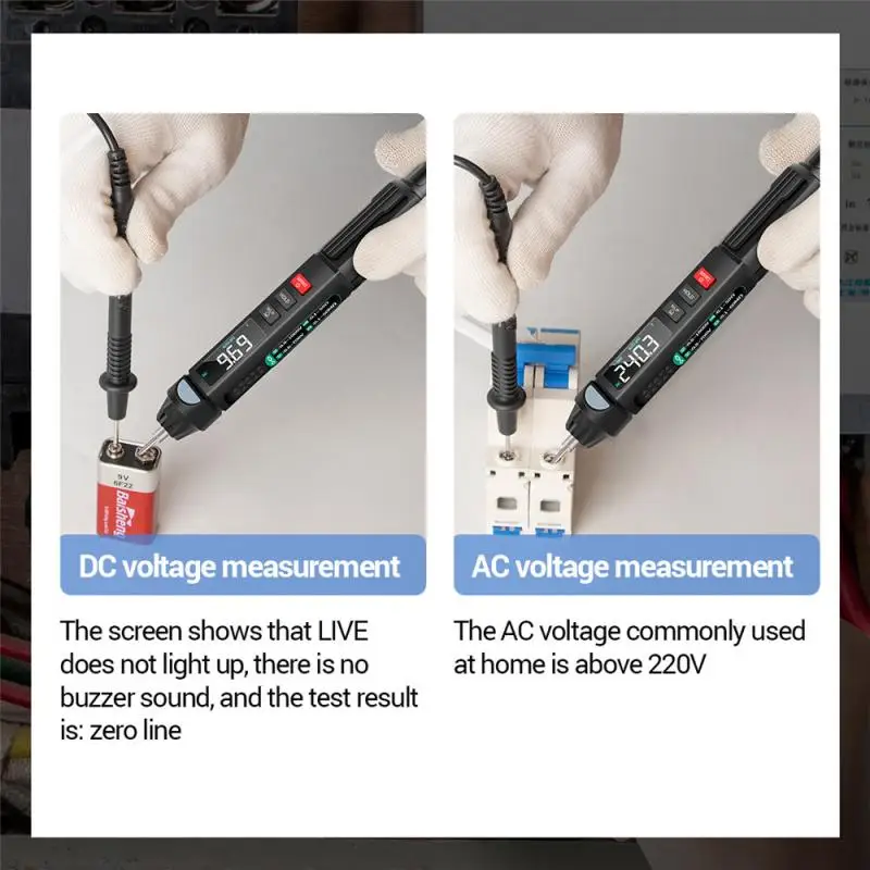 Универсальный мультиметр-ручка: Этот мультиметр отличается испытанием напряжения/сопротивления/емкости/диода/частоты/температуры, непрерывности, нулевой линии и бесконтактной фазы обнаружения последовательности и т. д.