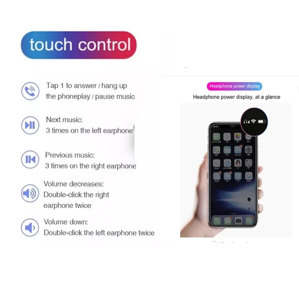 Характеристика:1. Короткое воспроизведение (пауза) музыки/ответ на вызов;2. Двойное (правое) двойное короткое нажатие для уменьшения (увеличения) громкости;3. Левый (правый) наушник нажимает 3 следующую (последнюю) музыку;4. Легко просыпается Siri5. Отменить открытую ситуацию и закрыть ее до закрытой ситуации;ПродуктПараметры:1. Вес изделия: 4-5g (один наушник).2. Время работы: 2-3 часа.3. Время работы в режиме ожидания: 100/ч для одного уха и 60/ч для обоих ушей.4. Время зарядки: 1-1,5 часов.