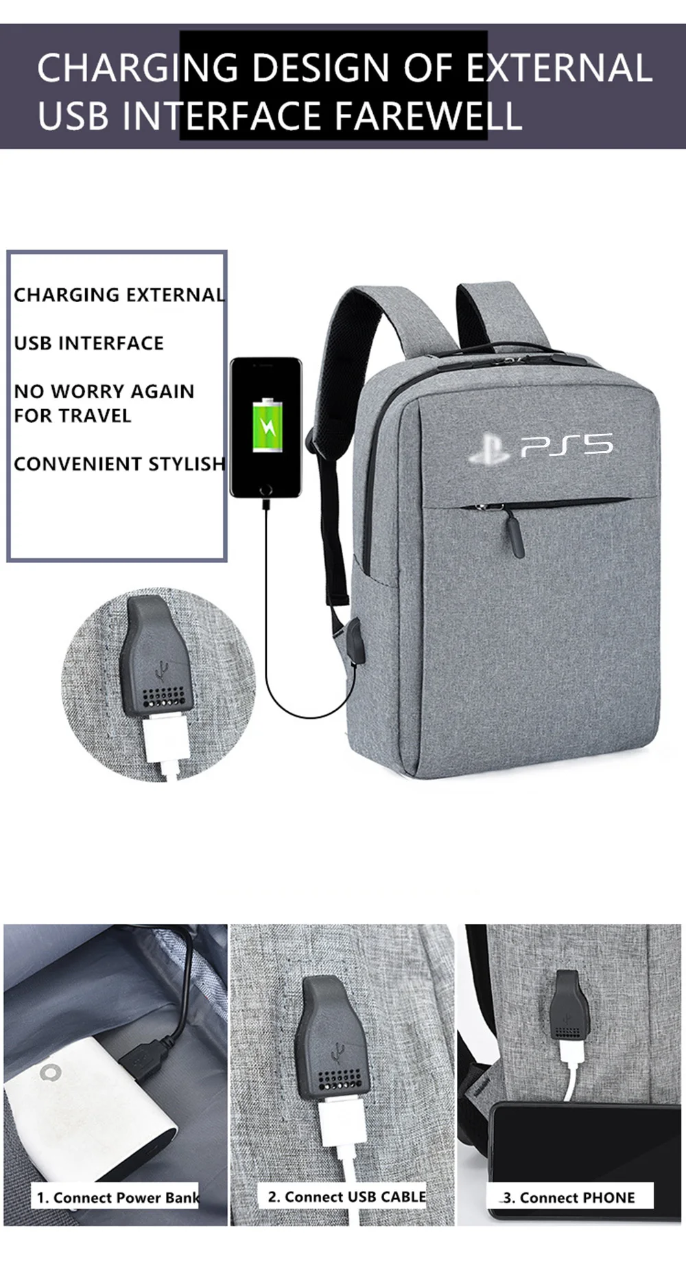 Этот рюкзак оснащен usb-разъемом, который может быть подключен к источнику питания для зарядки электронных устройств. (Вы должны принести свой собственный банк питания)