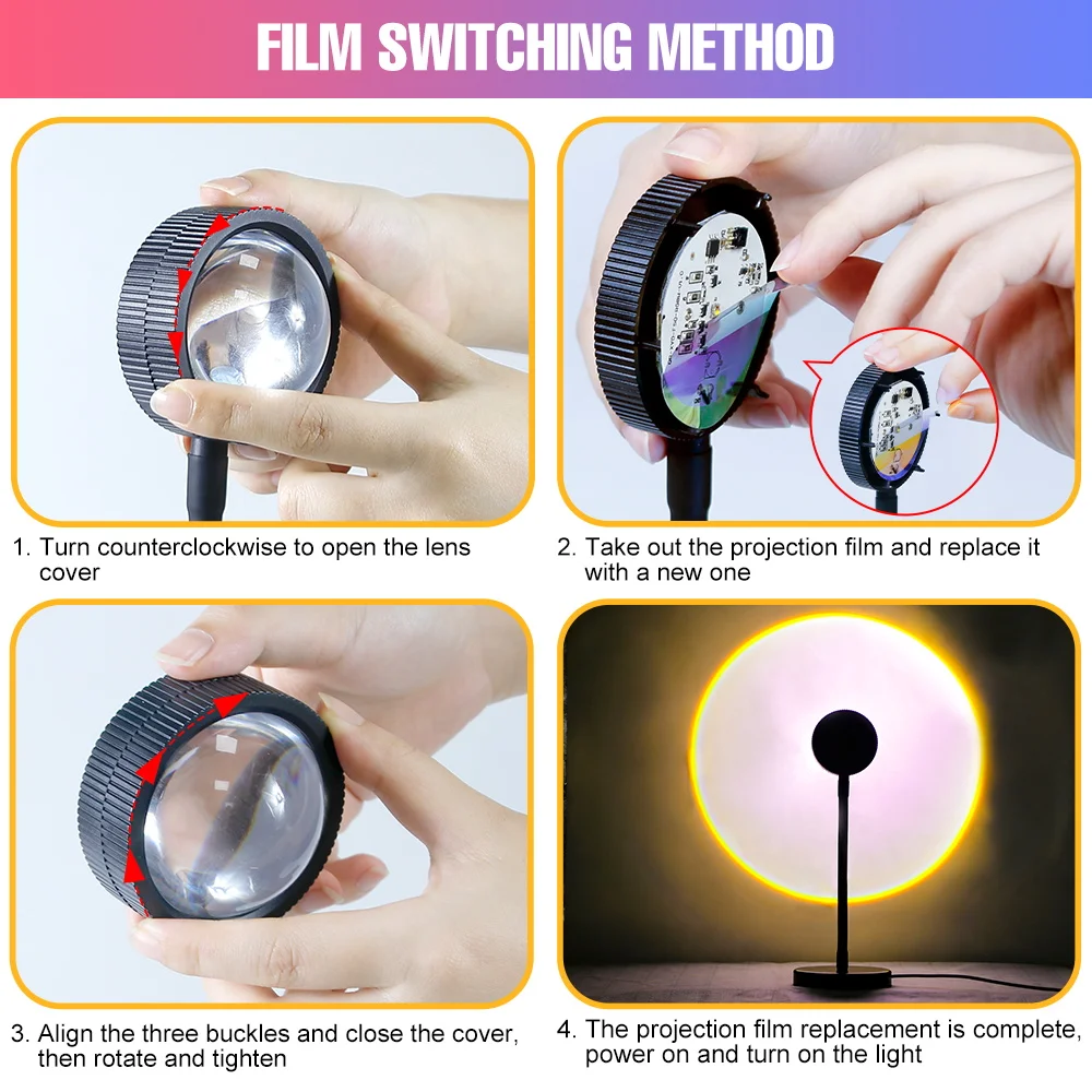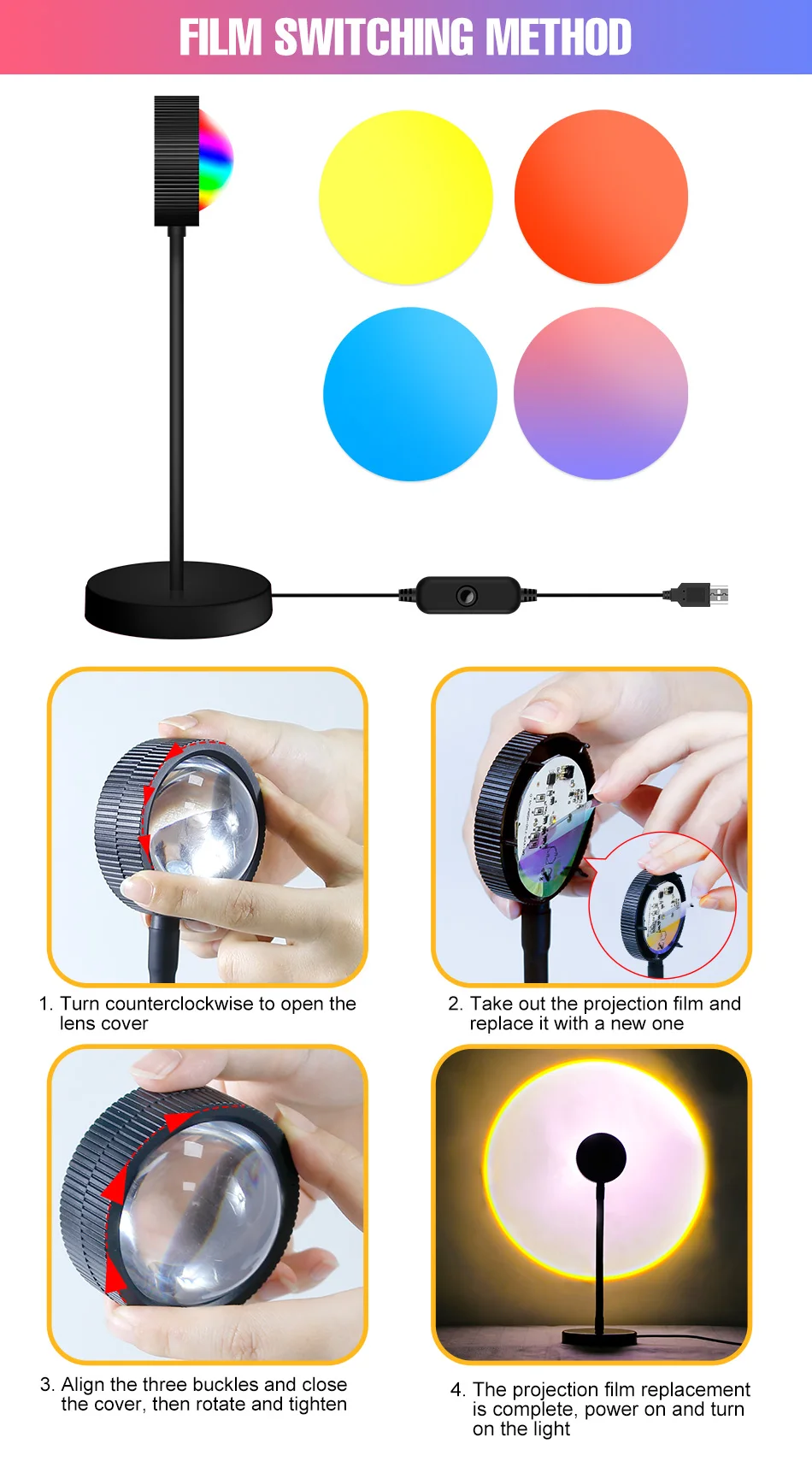 * Есть четыре цветных пленки, которые могут сочетаться с разными цветами в соответствии с личными потребностями. Вы можете использовать одну цветную пленку или несколько цветных пленок для создания разных цветов. Одна лампа может иметь несколько цветов.