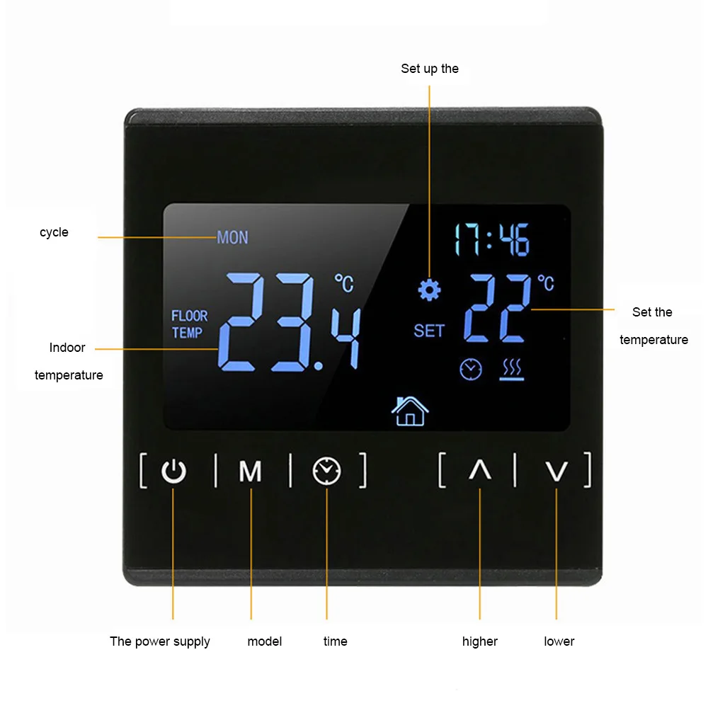 Этот цифровой термостат для напольного отопления использует передовое микрокомпьютерное управление чипом и высокоточный датчик для контроля температуры электрических нагревательных устройств.