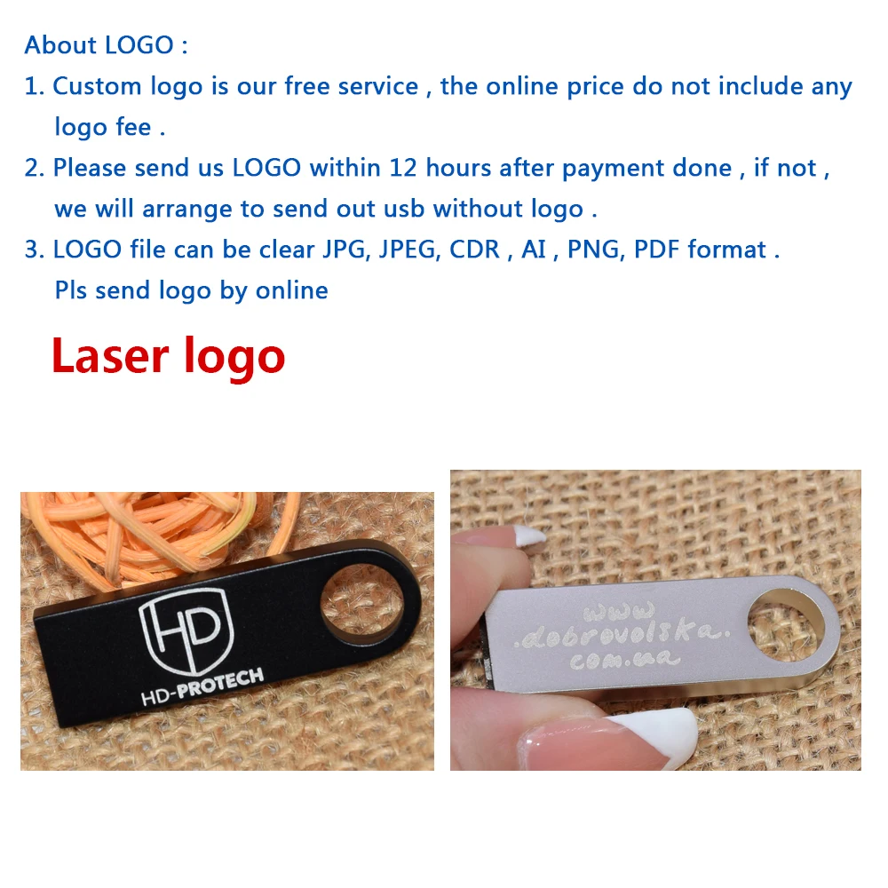 1.Бесплатный логотип. 2. Пожалуйста, отправьте свой логотип на странице после оплаты. 3. Логотип может быть JPG, JPEG, GIF, PNG, BMP формат, ограничение размера для загрузки на странице составляет 5 МБ. 4. Наш логотипГравировка по умолчанию и не имеет цвета. Пожалуйста, свяжитесь с нами для цветной печати.