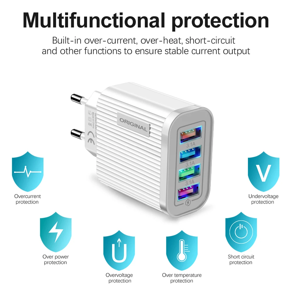 4 USB Мобильный телефон зарядное устройство 3.1A многопортовый Универсальный дорожный дом EU/US вилка настенная зарядная головка для планшета смартфонаХарактеристика:1. Подходит для дома, путешествий, офиса и т. д., простой и удобный для переноски и использования2. Широкая совместимость и практичность, Совместимость с большинством смартфонов и других цифровых продуктов на рынке.3. Обеспечивает многократную защиту зарядных устройств, таких как перегрузки по току, перенапряжения, перегрева, перезарядки и т. д. обеспечивает безопасность процесса зарядки и подключенных устройств. Спецификация:Материал: АБС-пластикНапряжение и ток: AC100-240V 50-60 Гц 0.35A DC5V = 3.1A (макс.) * 4USBЦвет: черный, белыйСпецификация: ЕС, СШАВес: США: 46 г, ЕС: 47 гРазмер: США: 45*27*70 мм; ЕС: 45*27*90 мм Примечание:1. Европейский стандарт ЕС-это круглая стопа, американский стандарт США-Плоская стопа.2. Данная модель не поддерживает быструю зарядку.3. Из-за различных настроек монитора и светильник эффект, фактический цвет элемента может быть s светильник ly отличается от цвета, представленного на снимках. Спасибо!4. Возможны отклонения в 1-2 см вследствие измерений вручную.