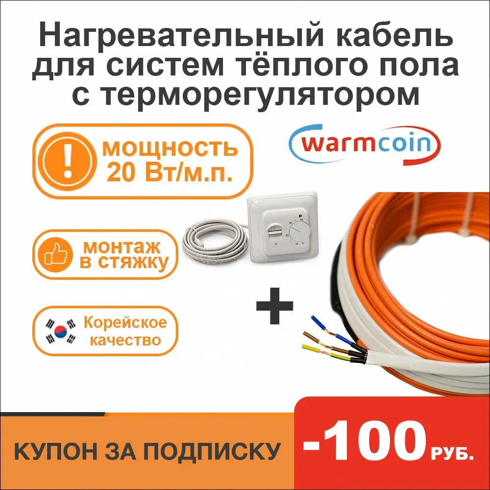 Нагревательный кабель Warmcoin POWER ECO 20 Втм с ТЕРМОСТАТОМ двухжильный