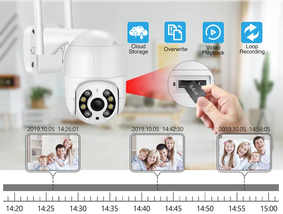 Поддерживает циклическую запись в течение всего времени, когда sd-карта заполнена, старое видео будет автоматически просматриваться новая запись.Поддержка записи сигнала тревоги движения, вы можете просто записывать, когда обнаруживает движение, чтобы сохранить больше памяти для вашей sd-карты и облачного хранилища.