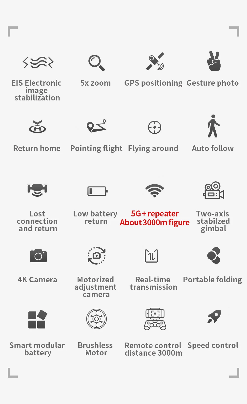 -Двойной режим GPS/ГЛОНАСС-4K HD регулируемая камера-Двухосевой электронный стабилизатор-Удержание высоты-Передача изображения в реальном времени-Интеллектуальный контроль-Объемный полет-Полетный путь-Точка заинтересованности-Посещение трассировки-Масштабирование изображения-MPH & m/s & km/h Конвертация-Складной портативный фюзеляж-Разворот курса с одной кнопкой-Редактирования видео-Управление жестами-Бесщеточный двигатель-MV функции: фильтры, видеоэффекты, добавление фоновой музыки, обмен фотографиями/видео