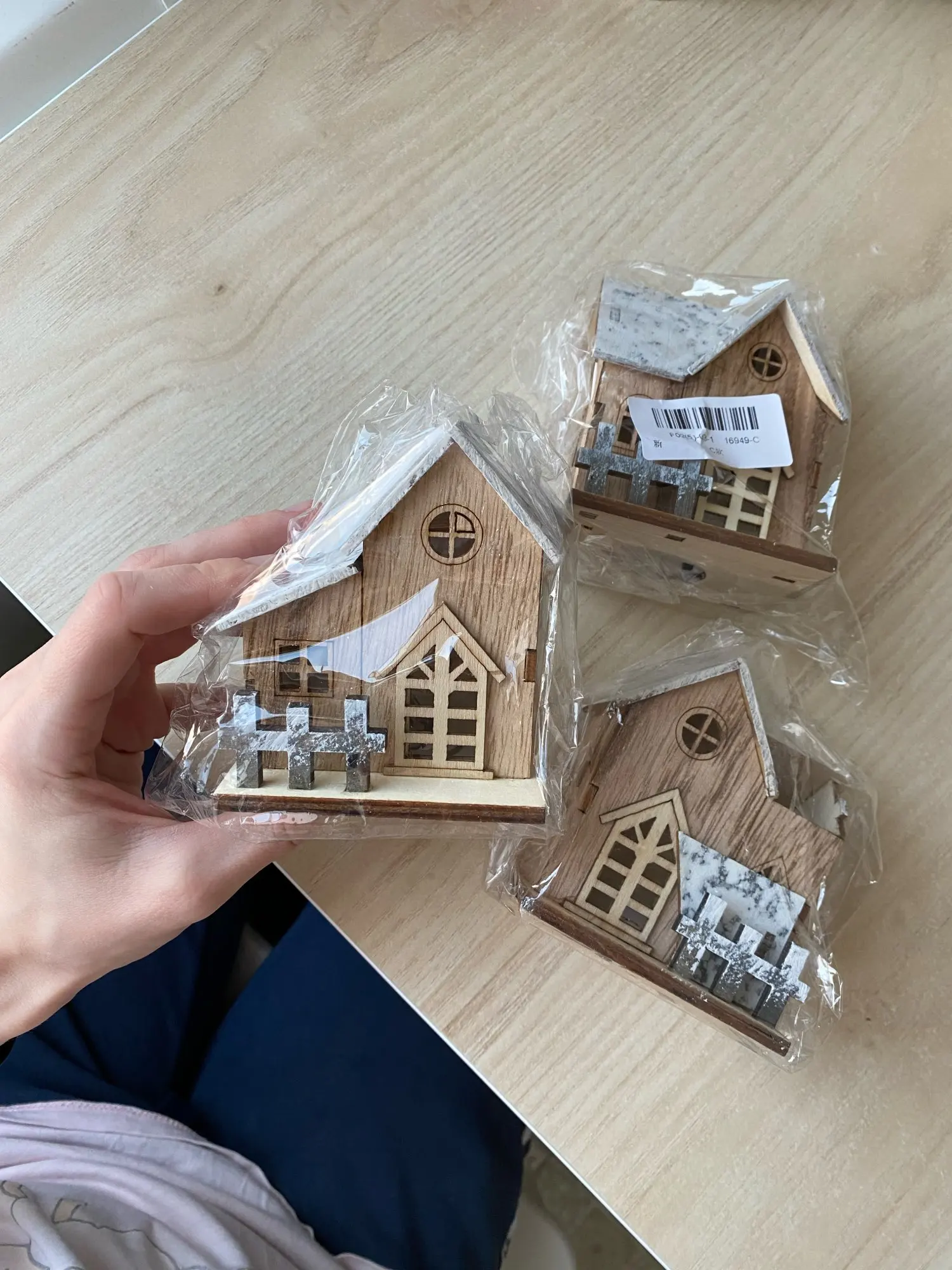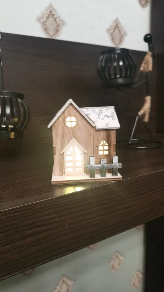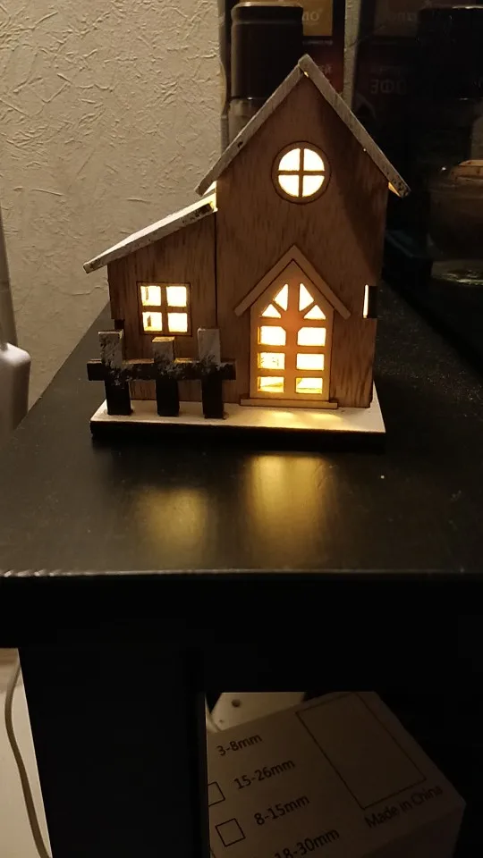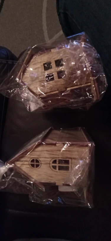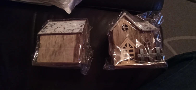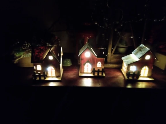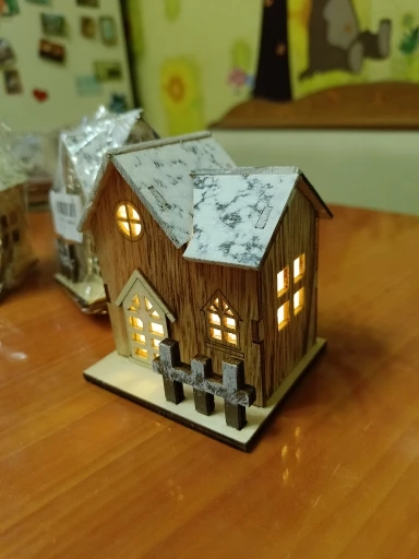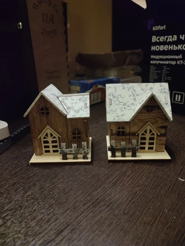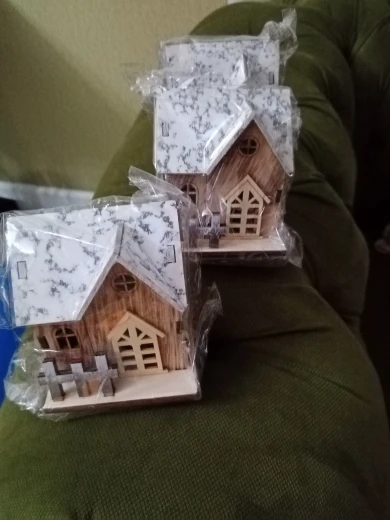 отличные деревянные домики. собраны в целом добротно, внутри небольшая лампочка теплого света. единственный минус, нужно запастись батарейками, очень быстро садятся