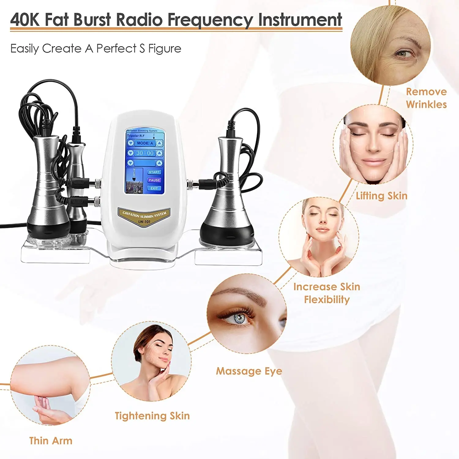 Используя собранную сильную звуковую волну, взрывную жировую головку излучаемых звуковых волн 40 кГц в человеческом теле, после того как она позволяет жировым клеткам организма производить сильное воздействие, может эффективно сжигать калории, влага и жировые клетки, жировые клетки уменьшаются, чтобы достичь эффекта удаления жира.A. Системная или местная гибель;B. Повышает скорость метаболизма организма, усиливает избавление организма от отходов и влаги;C. Ремонтные растяжки;D. Расслабляет мышцы, снимает мышечные спазмы, снимает мышечные боли;E. Рука затягивает стенку, ноги, бедра, бедра, поясницу, мышцы живота, реформирующий тип;F. Эффективно улучшает ягодицы и кожу, похожую на апельсиновую кожуру, решая проблему после родов.