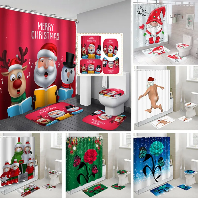 Рождественский домашний декор, набор водонепроницаемых занавесок для душа с крышками для туалета, коврик для ванной, нескользящий коврик, полиэстер, Санта-Клаус