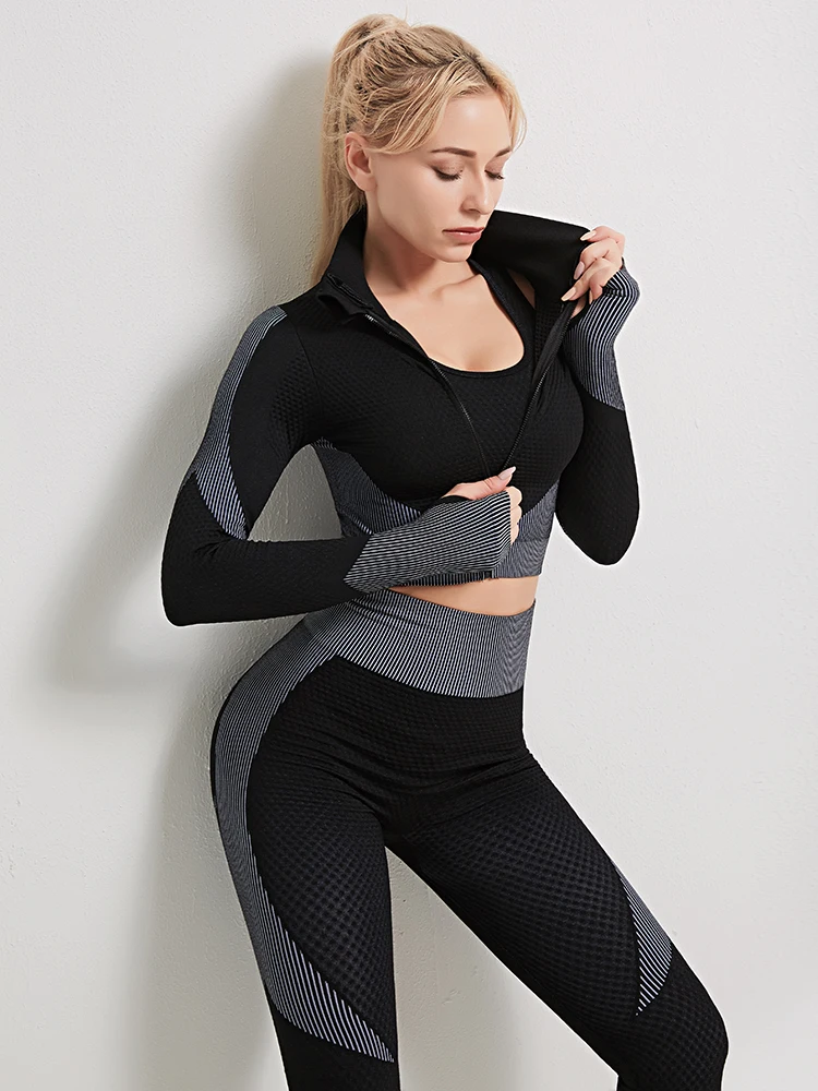 Новый зимний костюм из трех предметов, Леггинсы для йоги, комплект для фитнеса, тренировочный женский спортивный костюм, Топ с длинным рукавом, Колготки с высокой талией для упражнений