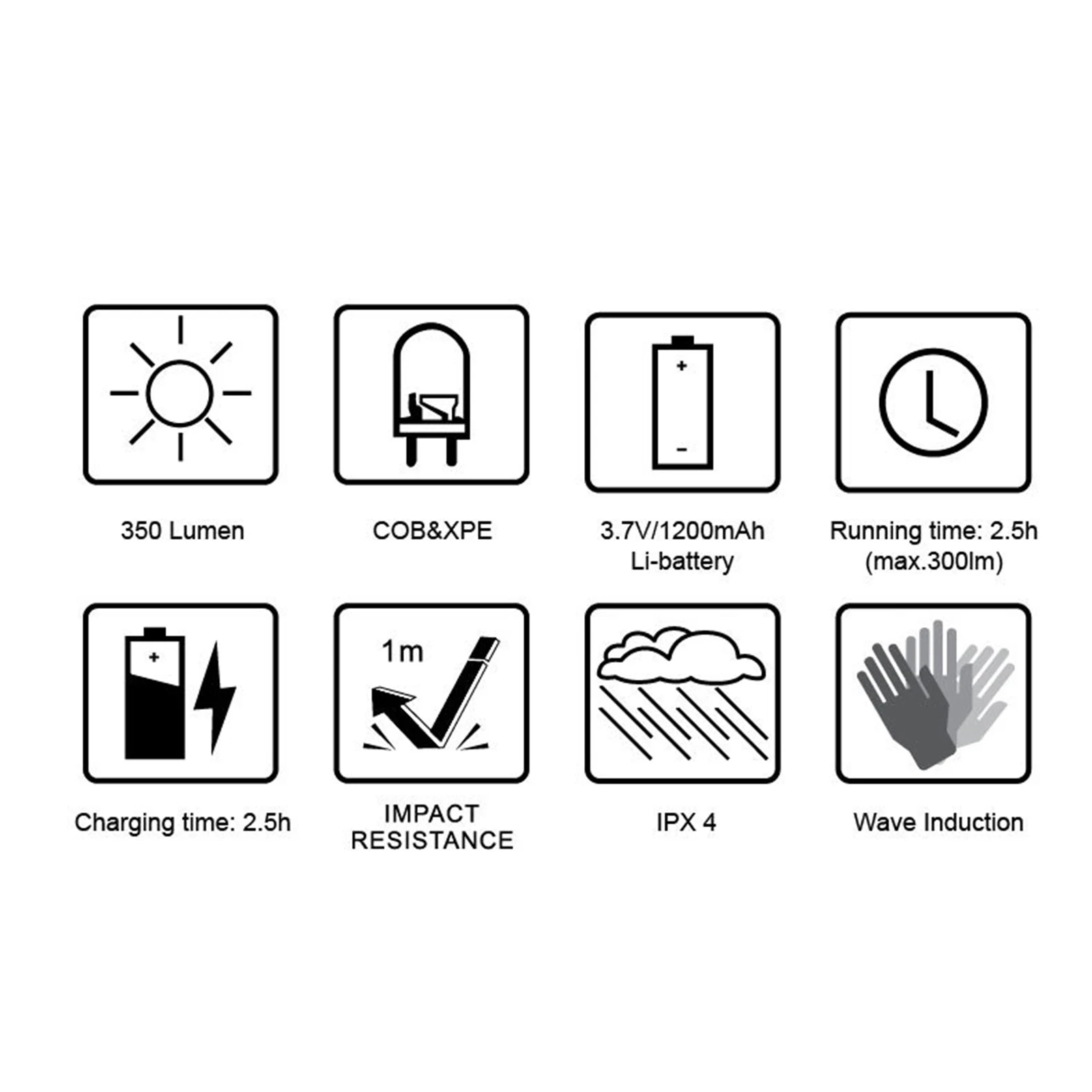 Режим освещения: конструкция с двойным переключателем (Индуктивный переключатель + выключатель питания), который можно переключать по желанию через пять уровней затемнения выключателя питания: COB High/COB Low/XPE High/XPE Low/Long press COB XPE strobe switch. Когда вы нажимаете Индуктивный переключатель, чтобы войти в Индуктивный режим, вы можете волна для управления освещением.