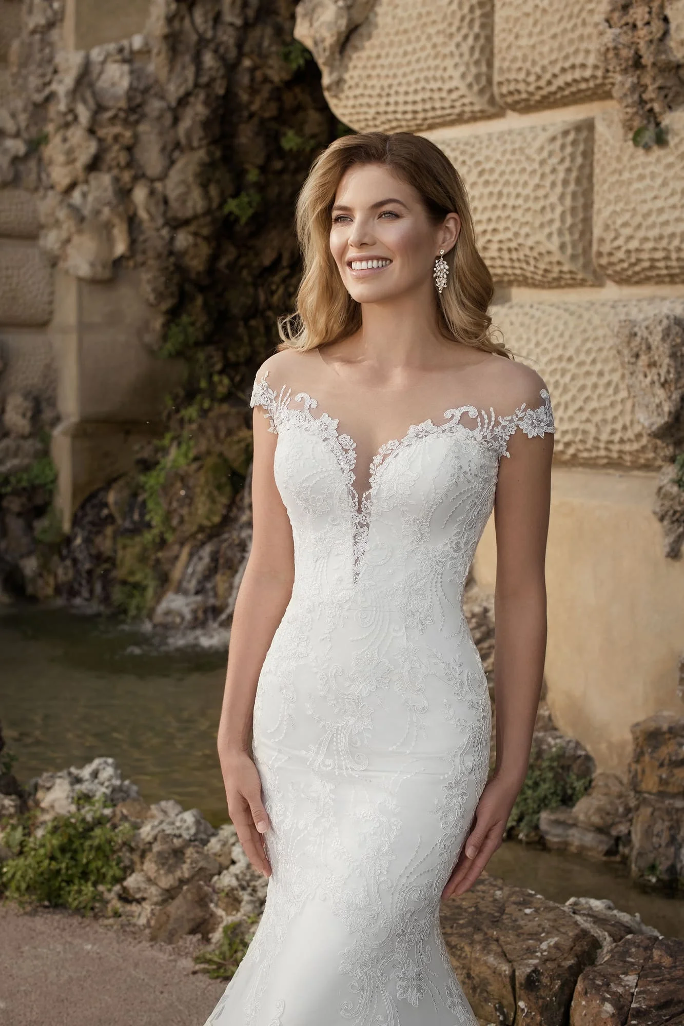 Свадебное платье с юбкой-годе, вырезом лодочкой и аппликацией, рука...