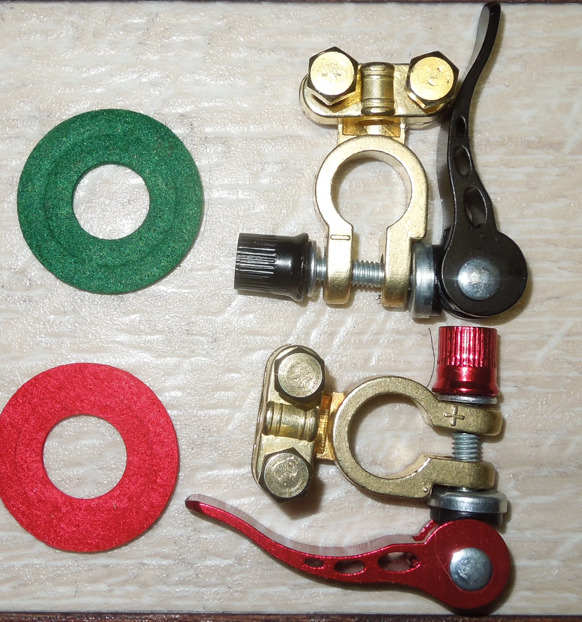 Посылку получил через 28дней в Республике Казахстан г.Алматы. Клемы качественные, металл светло-серого цвета(может анодированный) и довольно таки жёсткие, гайки с антифрикционной вставкой с одной стороны, чтобы самопроизвольно не откручивались. Сами клемы выглядят как оригинальные Японские. Покупал для Тойота Калдина 97г. Цена на момент покупки 17.01.2022г была 5.44$. Рекомендую к покупке.