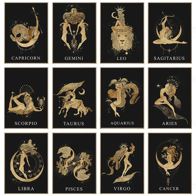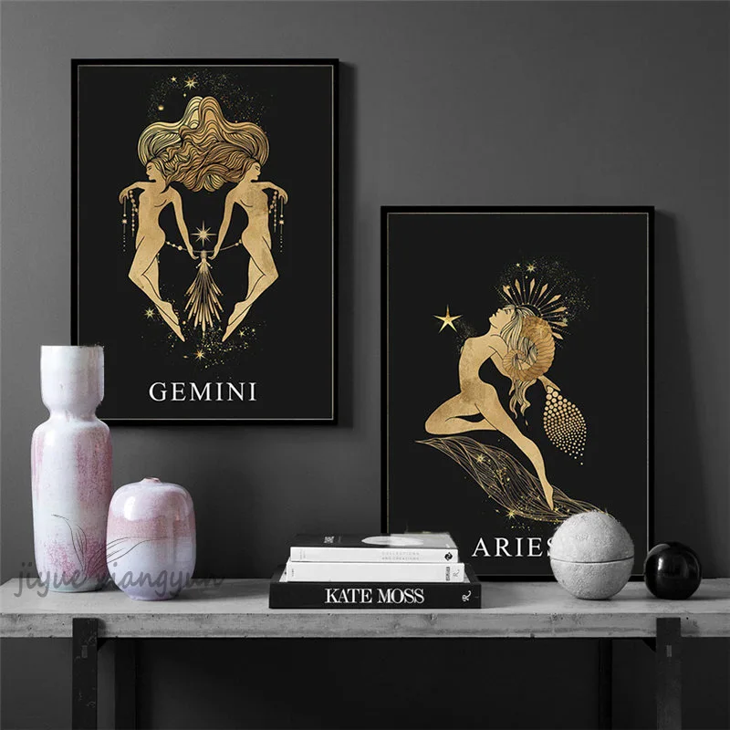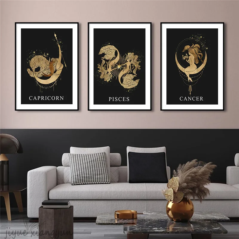 12 созвездий, черно-Золотая абстрактная настенная Картина на холсте, скандинавские постеры и принты, настенные картины для декора гостиной