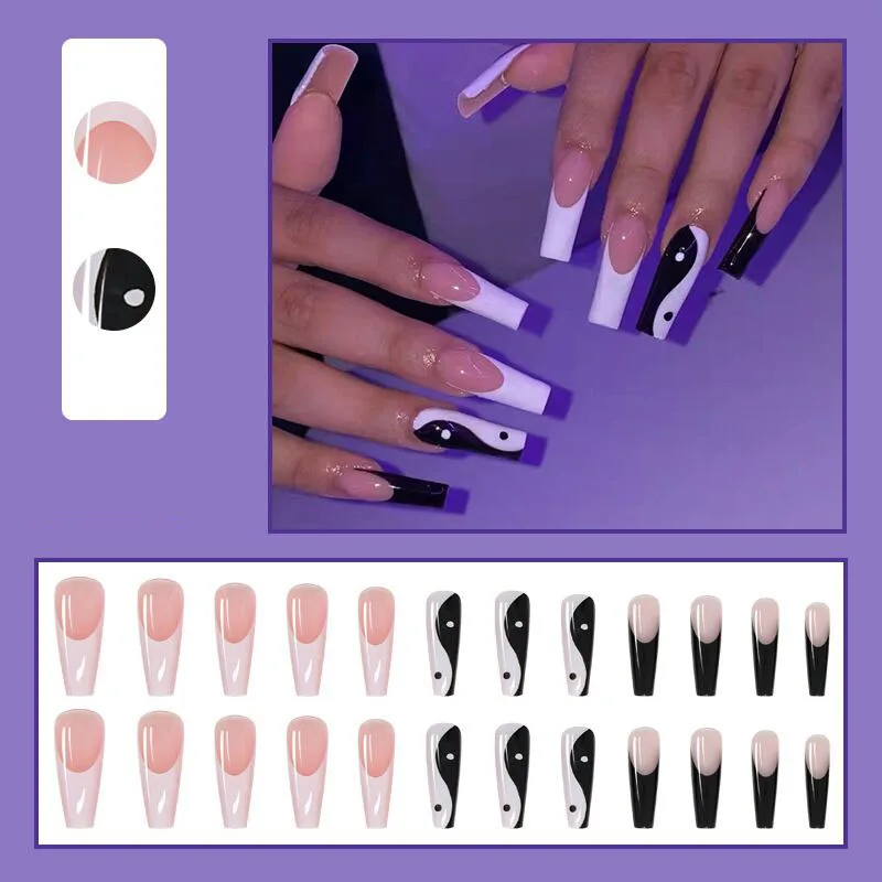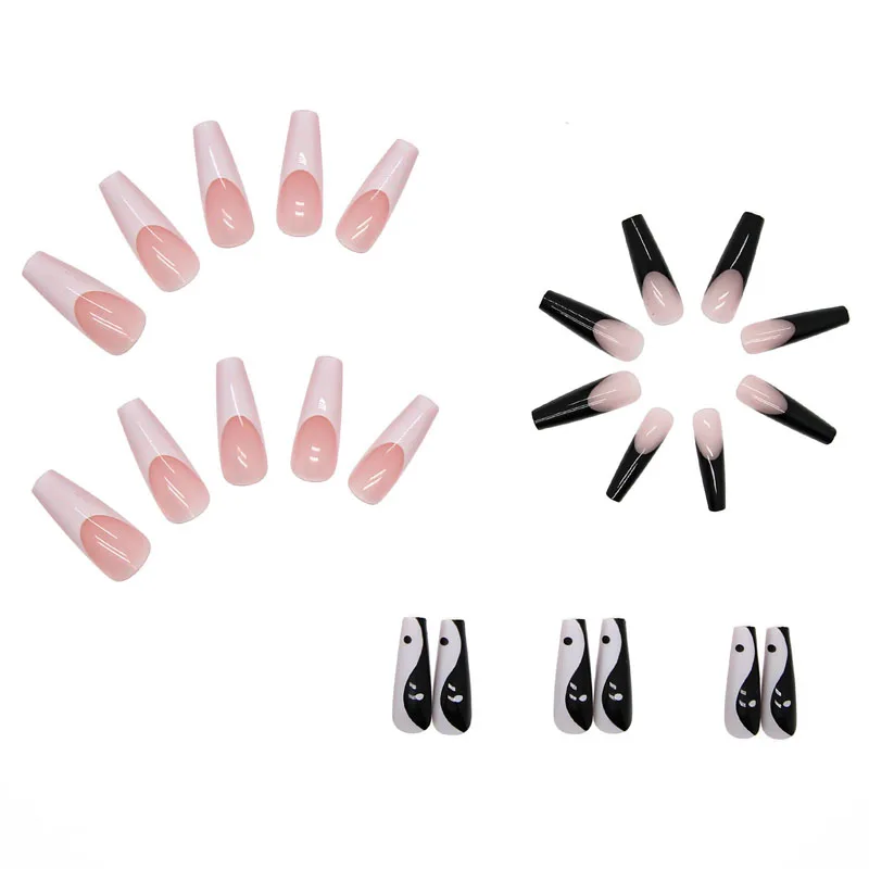 24 шт гроб поддельные ногти Съемный Черный Белый французский накладные ногти длинная наклейка для ногтей искусственные балерины ногти