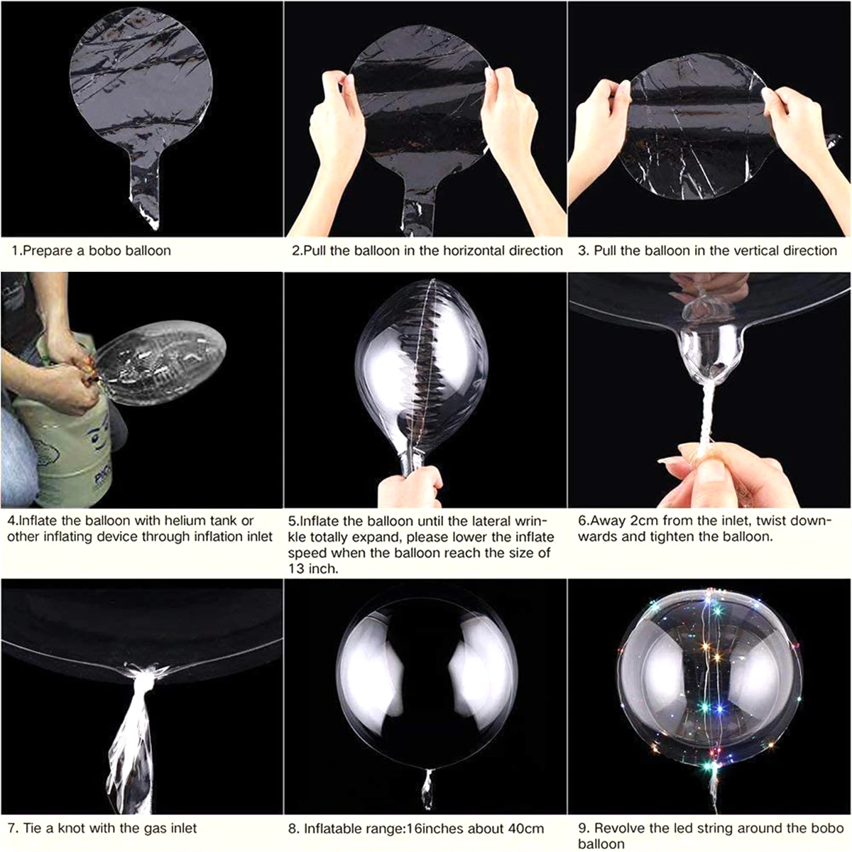 Размеры: 35-40 см (диаметр воздушного шара)Цвет: Прозрачный цветМатериал: ТПУПовод: Рождество, свадьба, день рождения и т. Д.Содержимое посылка:Bobo Balloon x 10 шт. и светодиодная гирлянда x 10 шт.; Bobo Balloon * 10 шт.Примечание:
