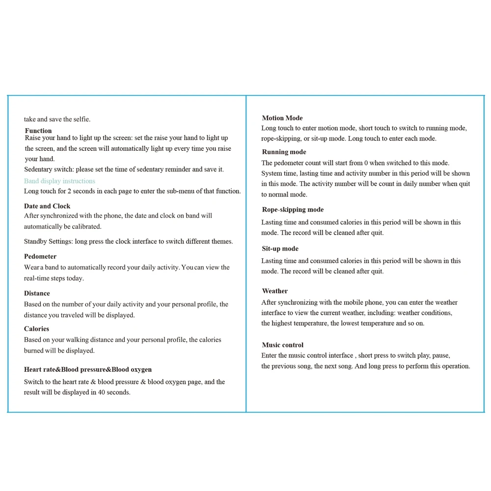 Особенности:1. Спортивная запись:Подсчет шагов, время упражнений, режим упражнений (сидения, бег, езда на велосипеде, бадминтон, настольный теннис, теннис, скакалка, Баскетбол), пробег упражнений, потребление калорий2. Мониторинг здоровья:Измерение пульса в реальном времени (динамический, статический), кровяное давление, режим сна3. Умное напоминание:Напоминание о сидячем положении, напоминание о звонке, push-сообщение (SMS / QQ / WeChat / Skype / Facebook / Twiter / Line / WhatsApp)4. Другие функции:Циферблат, контакт, режим не беспокоить, найти браслет, пульт дистанционного управления камерой, управление музыкой, секундомер, будильник, сброс устройства.Языки поддержки приложения: упрощенный китайский, английский, голландский, русский, французский, немецкий, португальский, испанский, турецкий, польский, тайскийПоддержка системы Мобильный телефон Android 5,0 и выше; iOS9.0 и выше; Поддержка Bluetooth 4,0.Загрузка приложения/APK синхронизация приложений Android и Apple: FitPro (система IOS загружается из APP Store, а qr-код на системе Android можно загрузить и использовать)Меры предосторожности1. Нельзя носить для купания и плавания.2. При синхронизации данных подключите браслет.3. Используйте прилагаемый зарядный кабель для зарядки.4. Не подвергайте кольцо ручки влаге в течение длительного времени, где температура чрезвычайно высокая или очень низкая.