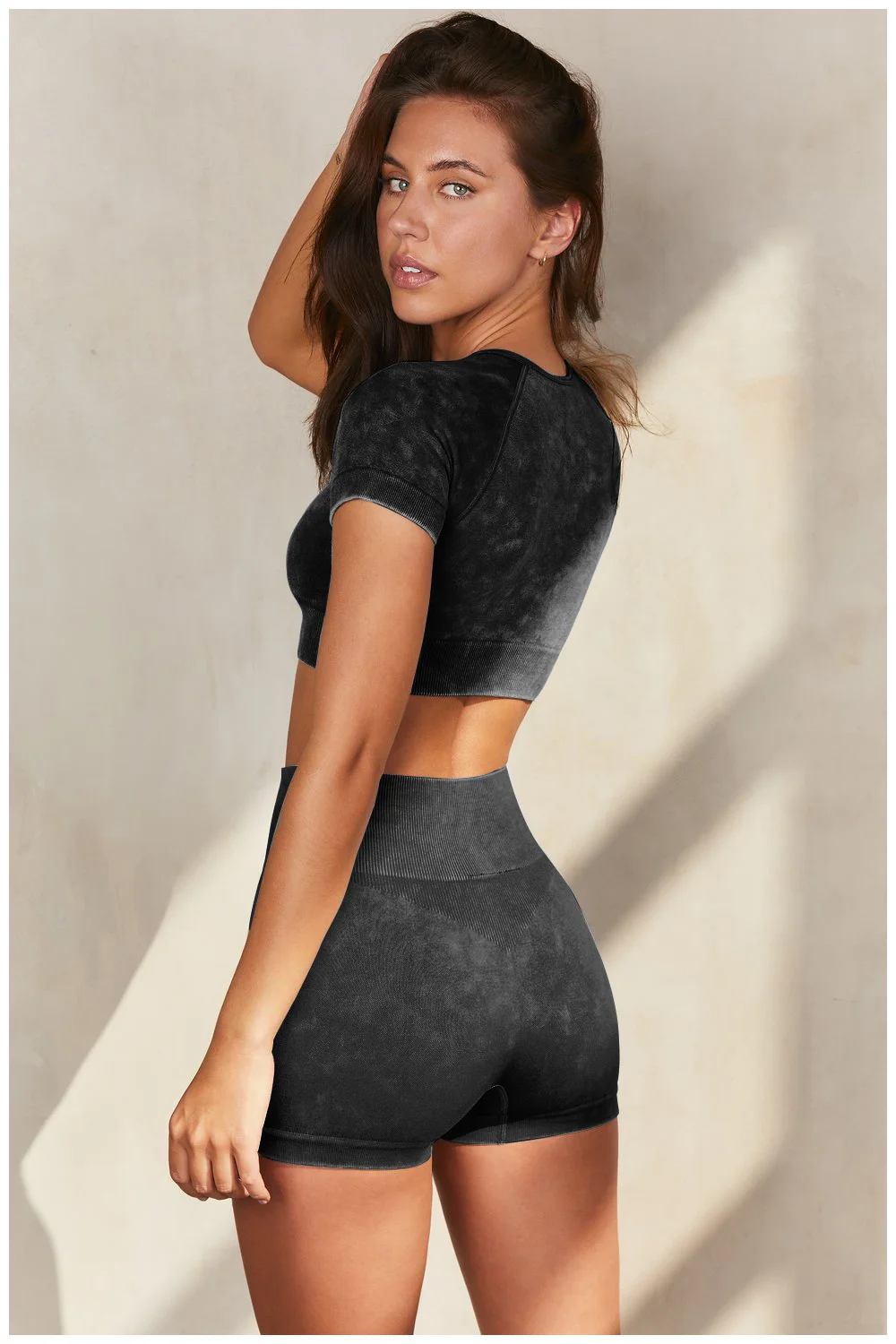 Костюм спортивный женский эластичный, Топ с длинным рукавом и шорты...