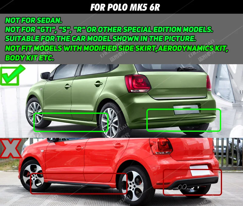 Фитинг: для Volkswagen VW Polo MK5 2010-2014 6R / 2015-2017 6CНе подходит для 4-дверный седан/салонНе подходит для модели «GTI», «S», «R» или другой специальной модели