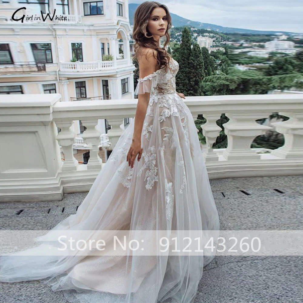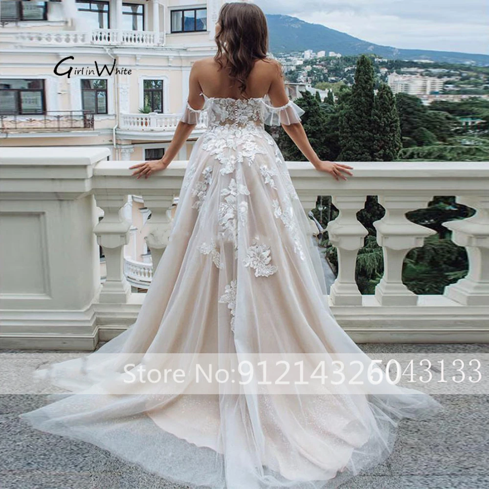 Женское ТРАПЕЦИЕВИДНОЕ свадебное платье, привлекательное Тюлевое платье цвета шампанского с открытыми плечами, аппликацией без рукавов, официальное платье для невесты, 2021