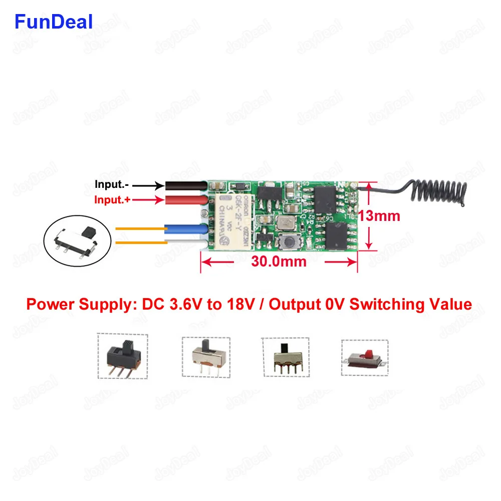 1. Мгновенное:Нажмите кнопку дистанционного управления, реле подключается, отпустите кнопку дистанционного управления, релейное соединение.2.Переключатель:Нажмите, как только кнопка дистанционного управления, реле подключается, нажмите дважды кнопку дистанционного управления, реле соприкосновения.3.Фиксация:Нажмите кнопку дистанционного управления A, реле подключается, нажмите кнопку дистанционного управления B, реле соприкосновения.4.Режим задержки времени:Нажмите кнопку дистанционного управления, реле подключается, от когда отпустите кнопку дистанционного управления, после 5s или 10s или 15s или 20s, реле отключается автоматически.