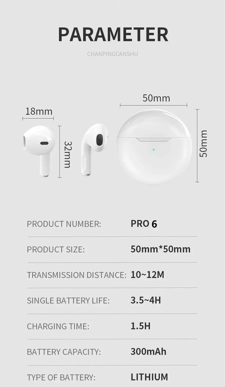 Беспроводные стереонаушники Air Pro 6 TWS, наушники с микрофоном, с поддержкой Bluetooth 5,0, для спорта, Xiaomi, Iphone