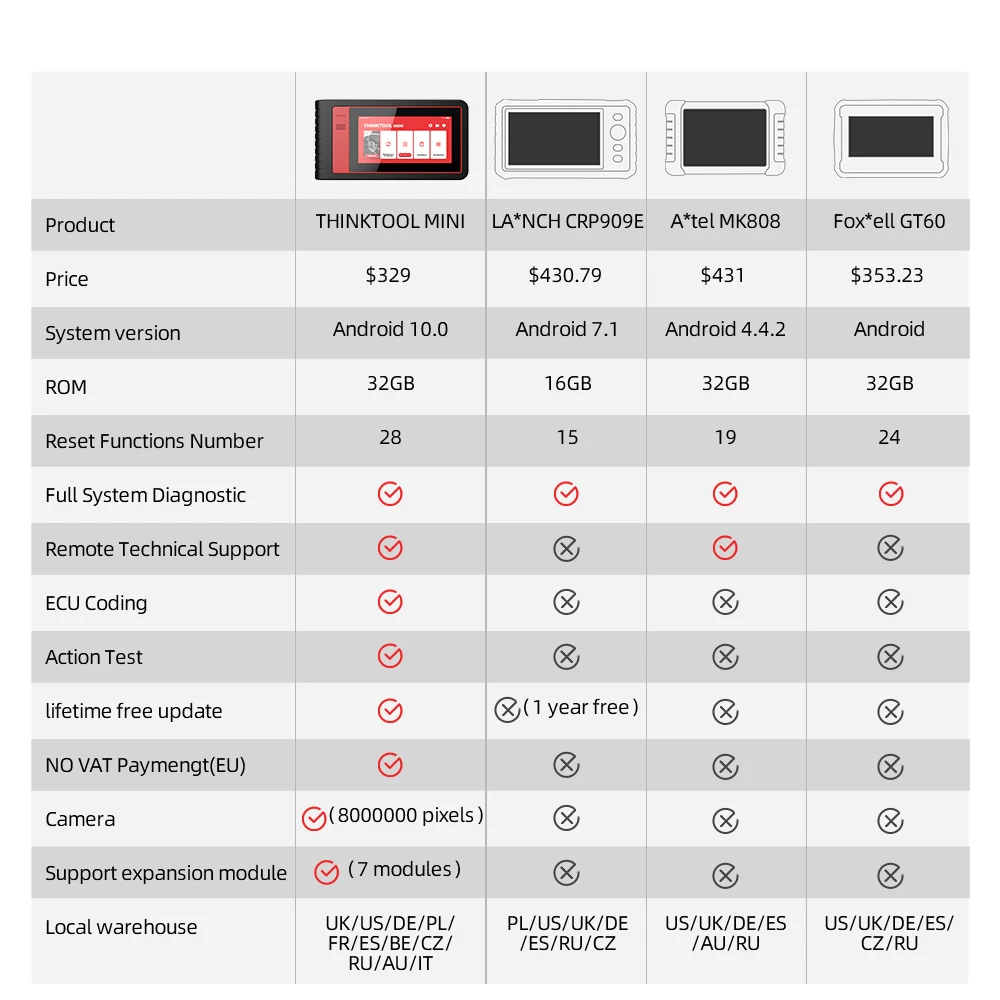 1. Бесплатное считывание кода в системе, очистка кода, потоковая передача данных и обновления для всех моделей.2. Функция полного сброса бесплатна для использования (в настоящее время 16 и будет увеличена до 26-28 позже).3. После подписки на программное обеспечение, вся система может быть диагностирована с полными функциями (экшен-тест, специальная функция, cding может быть осуществлена).4. Система Android может быть обновлена онлайн.5. Вся система диагностирует более 93 автомобильных брендов.6. Диагностика охватывает все модели, поддерживающие протокол OBD после 1996 года.7. Оснащен интеллектуальными идентификационными моделями с кодом VIN.8. Дизайн серии THINKCAR, пылезащитный, ударопрочный, легко хранить9.5.99 дюймовый дисплей удобен для диагностики автомобиля в режиме реального времени10,2G RAM/ 32G ROM, поддержка Bluetooth и WiFi подключения11. Оплатите один автомобиль модель программного обеспечения может наслаждаться бесплатным обновлением 1 год полной системы, такие как: ECU кодирование/экшен тест и другие специальные функцииСтоимость: $49,95/год (вы можете купить напрямую из ThinkCar Store)