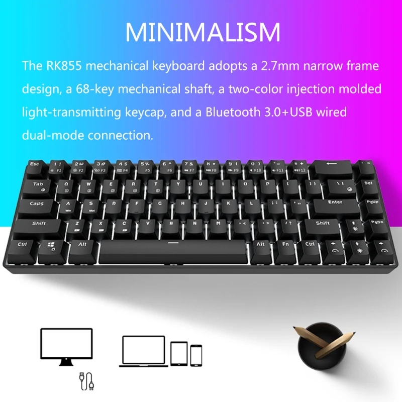 RK68 RK855 беспроводная клавиатура 68 клавиш RGB с подсветкой BT беспроводной игровой умный подарок F92AOOTDTYОсобенности на 100% абсолютно новый и высокого качестваПоддержка Горячая замена и замените все Gateron/Cherry MX-подобными Механическая переключатели существующими на рынке свободно, Поддержка Горячие об обмене 3-контактный/5-контактный переключатели.Более гладкий, тихий и быстрый. Преобладает между офисными работниками, девушками и любителями игр. Подключи и играй, не нужно водить, Игровая клавиатура имеет встроенный пользовательский чип игры, который действительно достигает без потери качества и быстрого ответа без каких-либо проблем с прерывистым или задержкой.У него отличные отзывы от руки, долгий срок службы. Не требует слишком много ключей, прост в использовании.Применимые люди: предназначены для геймеров, офисных работников, копирайтеров, программистов, редакторов и т. д.Параметры: Название: RK68 (RK855) зелено-ось игровая механическая клавиатура 68-клавишная клавиатураМатериал: АБС-пластикИнъекция: двухцветная инъекцияНазначение: Двойной режим (игра/офис)Интерфейс: совместим с USB / BluetoothЦвет: черный/белый (по желанию)Размер: около 31x10.2 см/12.2x4.01inchПосылка включает в себя: 1 x механическая клавиатура1 х соединительный кабель1 х РуководствоПримечание: В последней версии RK68 в 2021 году вместо пяти можно подключить только три устройства, совместимые с Bluetooth. Если у вас есть какие-либо вопросы, пожалуйста, свяжитесь со службой поддержки клиентов, спасибо.Программное обеспечение RGB может использоваться только в проводном режиме клавиатуры.В настоящее время программное обеспечение RGB поддерживает использование только в оконной системе.Возможны отклонения в 0-1 см вследствие измерений вручную. Пожалуйста, убедитесь, что вы не возражаете, прежде чем сделать ставку.Из-за разницы между различными мониторами изображение может не отражать фактический цвет изделия. Спасибо!