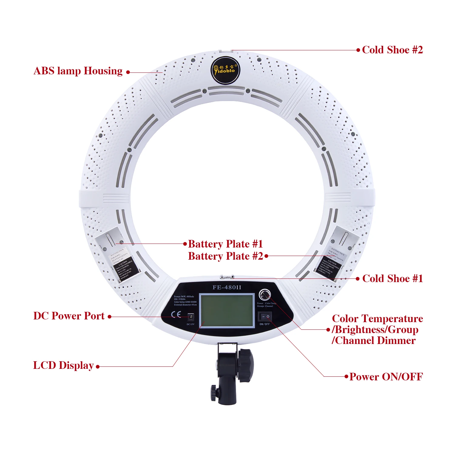 Двухцветная кольцевая лампа FE-480 II подходит для съемки на открытом воздухе. Персонажи и свадебные фотографии, макияж освещение, студии и т. Д.